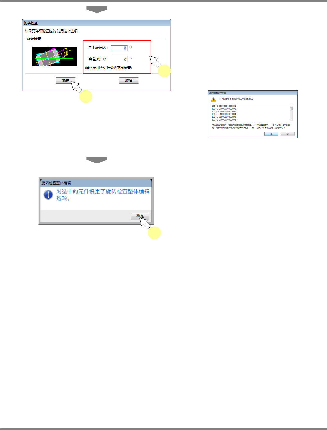 NPM-DGS 程序手册 6.7 现有元件的编辑 Page 6-208 EJS9AC-MB-06P-28 倾斜范围检查 ( 整体设定 ) 在这个功能下,能够在元件管理画面 上设定倾斜范围检查。 对主元件程序库、生产线元件程序库 中的任何一方的元件都可进行设 定。 1 选择想要进行整体编辑的元件。 选择多个时, 在按 [Shift] 键或 [Ctr l] 键的同时选择 元件。 2 选择右击菜单上的 [ 整体编辑 ] [ 旋转 …