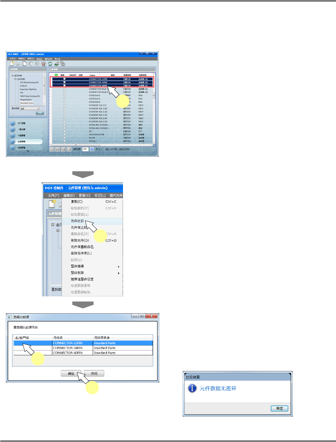 NPM-DGS 程序手册 6.7 现有元件的编辑 Page 6-214 EJS9AC-MB-06P-28 元件数据的比较 通过这项功能,可针对所选择的元件 ,对元件数据的整体进行比较。 另外,还可在比较结果画面上,通过 元件编辑器修改元件数据。 1 选择多个想要比较的元件。 使用比较这项功能, 需要选择两个以上的元件。 选择多个元件时, 可在按住 [Shift] 键或 [Ctrl] 键的 同时选择元件。 2 选择 [ 编辑 …
