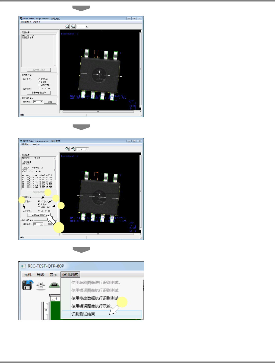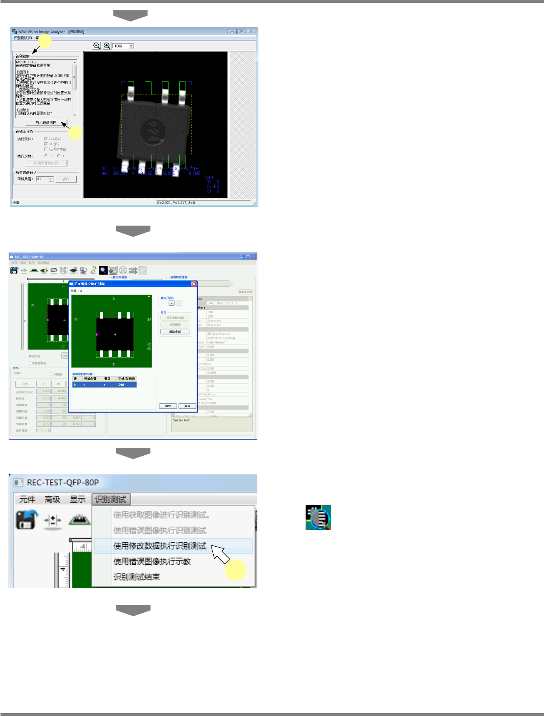 NPM-DGS 程序手册 6.9 使用设备识别错误图像执行识别测试 EJS9AC-MB-06P-28 Page 6-233 将显示经修正数据修改后的识别结果 。 如果仍得不到解决,请再次在编辑项 目下修改 数据,并再次执行识别测试。 10 点击 [ 识别率评价执行 ] ,或选择菜单栏 的 [ 识别测试 ] [ 使用修改数据执行识 别测试 ] 后, 反复执行识别来确认数据的 可靠性。 e. ‘X/Y 移动 ’ 如果复选框内打勾…