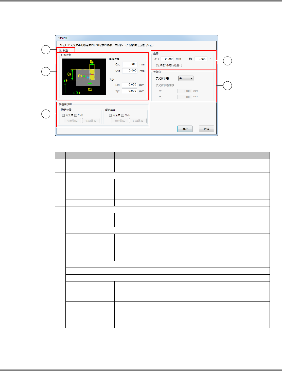 NPM-DGS 程序手册 6.12 头照相机识别选项 EJS9AC-MB-06P-28 Page 6-257 6.12.3 上面识别 对 LED 元件等所拥有的萤光体执行头照相机识别 后进行吸着,由此可通过补正使 萤光体的中心转 为贴装位置。 上面识别的设定项目 No. 名称 说明 1. ‘ 补正 ’ 对元件进行 ‘ 上面识别 ’ 的设定。 无需设定时,请不要勾选复选框。默 认值为 ‘ 勾选 ’ 状态。 2. ‘ 识别对象 ’ …