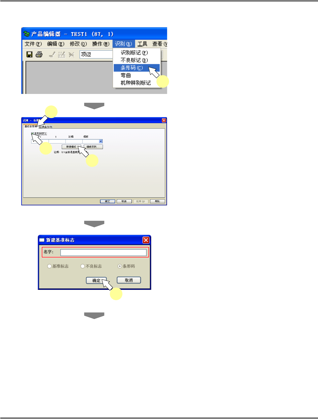 NPM-DGS 程序手册 5.8 PCB 编辑 Page 5-212 EJS9AC-MB-05P-31 6 对要编辑的地方进行必要的设定, 点击 [ 应用 ] 。 7 点击 [ 确定 ] 。 关闭 < 标志编辑器 > 画面。 8 进行基板条形码的设定。 9 点击 [ 确定 ] 。 关闭 < 识别 – 条形码 > 画面。 在 PCB 编辑器上显示出基板条形码。 Project050702S-0 2C05…