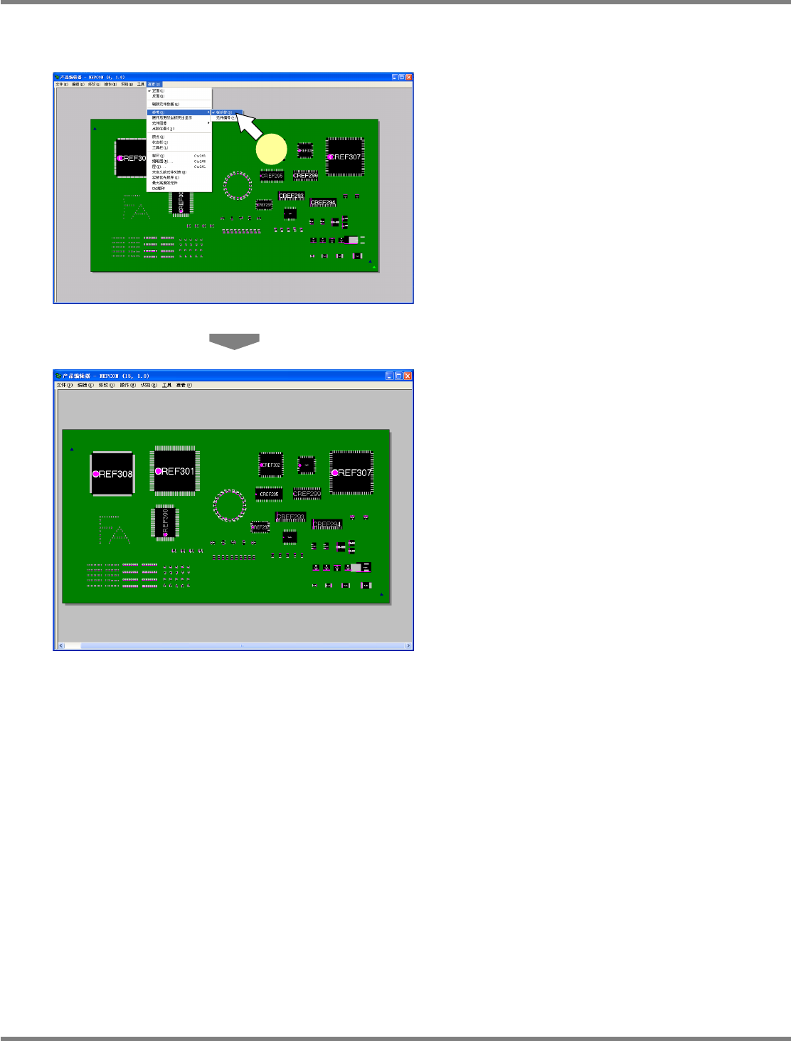 NPM-DGS 程序手册 5.8 PCB 编辑 Page 5-238 EJS9AC-MB-05P-31 自由球的布局显示 1 选择菜单栏的 [ 查看 ] [ 自由球的布 局 ] 。 将显示自由球元件的布局。 Project050802S-1 56C00 Project050802S-1 55C00 1