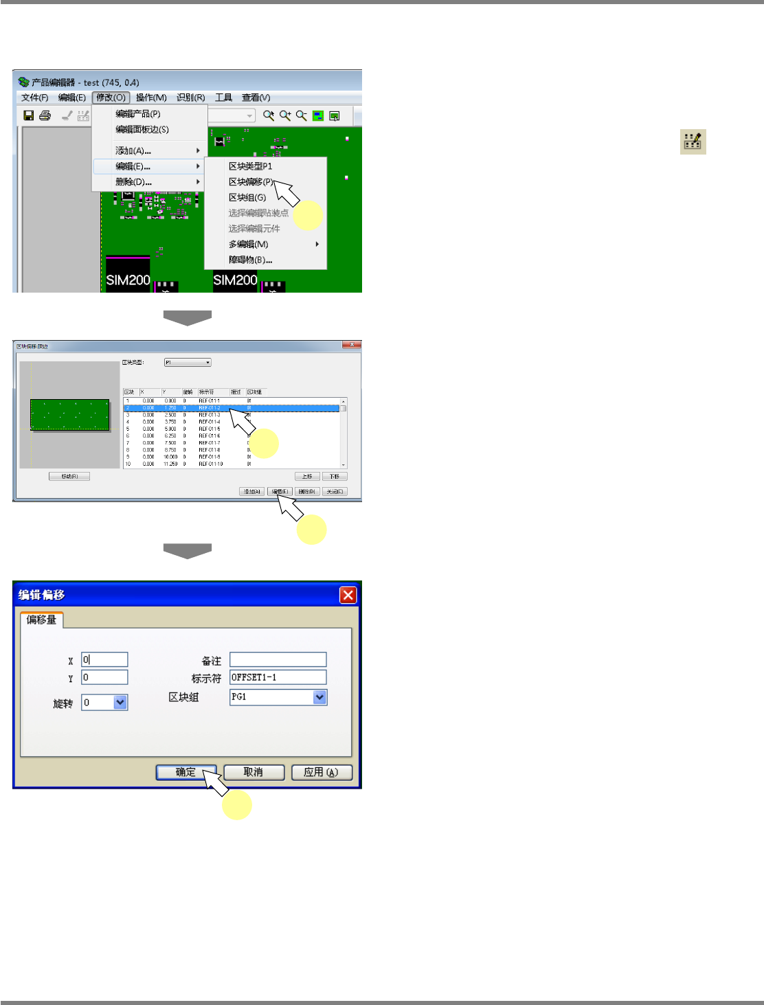 NPM-DGS 程序手册 5.8 PCB 编辑 Page 5-298 EJS9AC-MB-05P-31 编辑偏移量 1 选择菜单栏的 [ 修改 ] [ 编辑 ] [ 区块 偏移 ] ,或者在所选元件上弹出右击菜 单, 选择 [ 区块偏移编辑 ] , 或者在 PCB 图像中选择元件, 再选择工具栏的 ( 区块偏移 ) 编辑。 将会显示 < 区块偏移 : 顶边 > 画面。 2 选择要编辑的区块偏移。 3 点击 […
