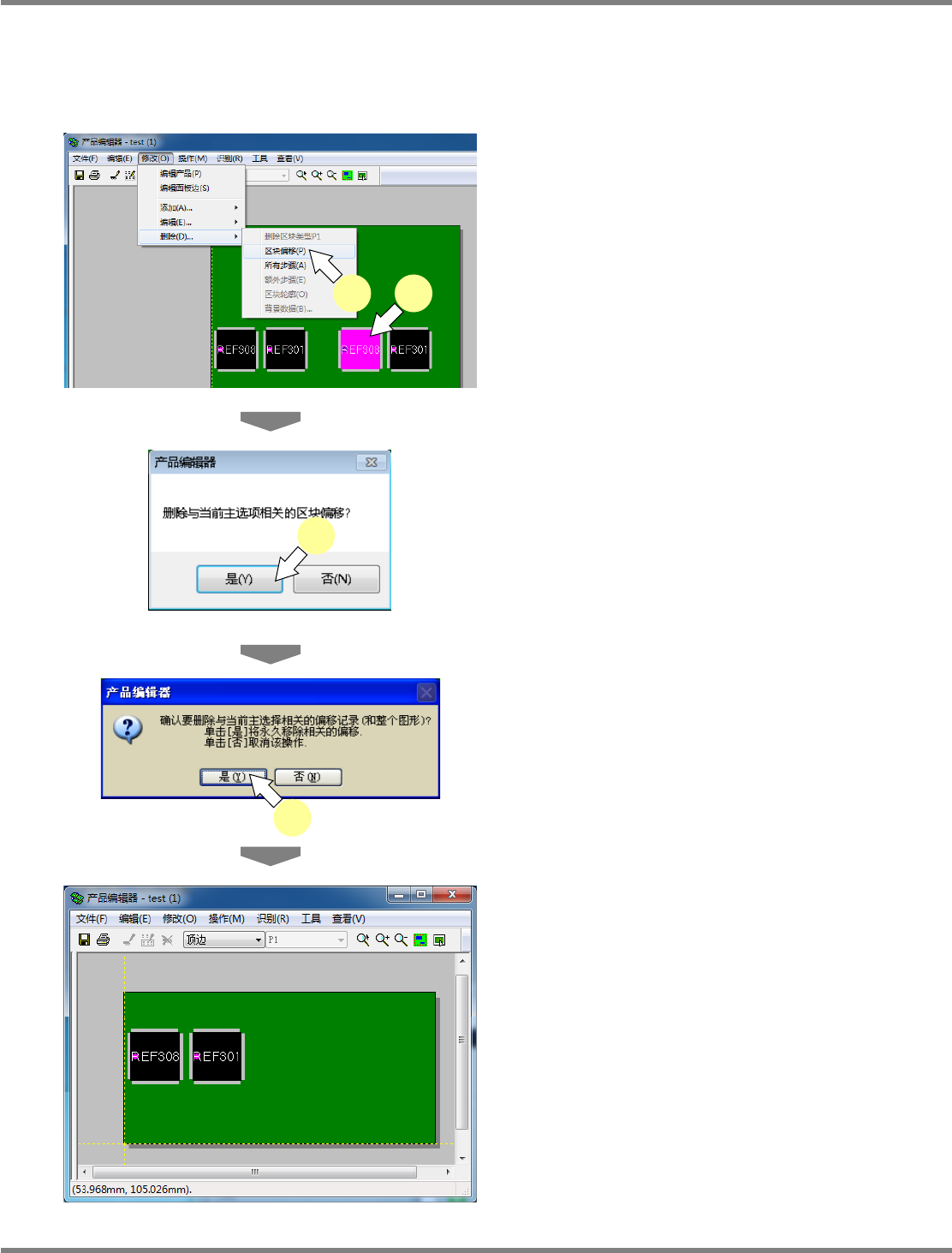 NPM-DGS 程序手册 5.8 PCB 编辑 Page 5-300 EJS9AC-MB-05P-31 ② 在 < 区块偏移 : 顶边 > 画面删除 1 选择需要删除区块补偿值的区块类型。 2 选择要删除的区块偏移。 3 点击 [ 删除 ] 。 4 点击 [ 关闭 ] 。 补偿值移动 1 显示 < 区块偏移 : 顶边 > 画面后,选择需 要移动的区块补偿值。 2 点击 [ 移动 ] 。 显示 < 移…