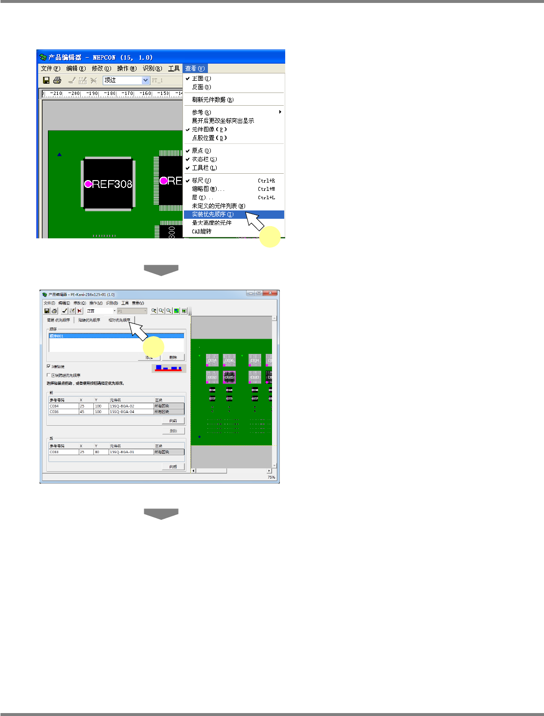 NPM-DGS 程序手册 5.8 PCB 编辑 Page 5-342 EJS9AC-MB-05P-31 6 在先装表 / 后装表中选择要从序列里删 除的元件。 如果不把元件从一览表中删除,请进 行步骤 8. 的作业。 7 点击 [ 删除 ] ,或者将所选择的元件从先 装表 / 后装表中拖放到 PCB 编辑器上。 所选元件图像将被显示在 PCB 编辑器上, 从先 装表或者后装表中消失。 8 点击 ‘3 维贴装 ’ ,变更设定。 …