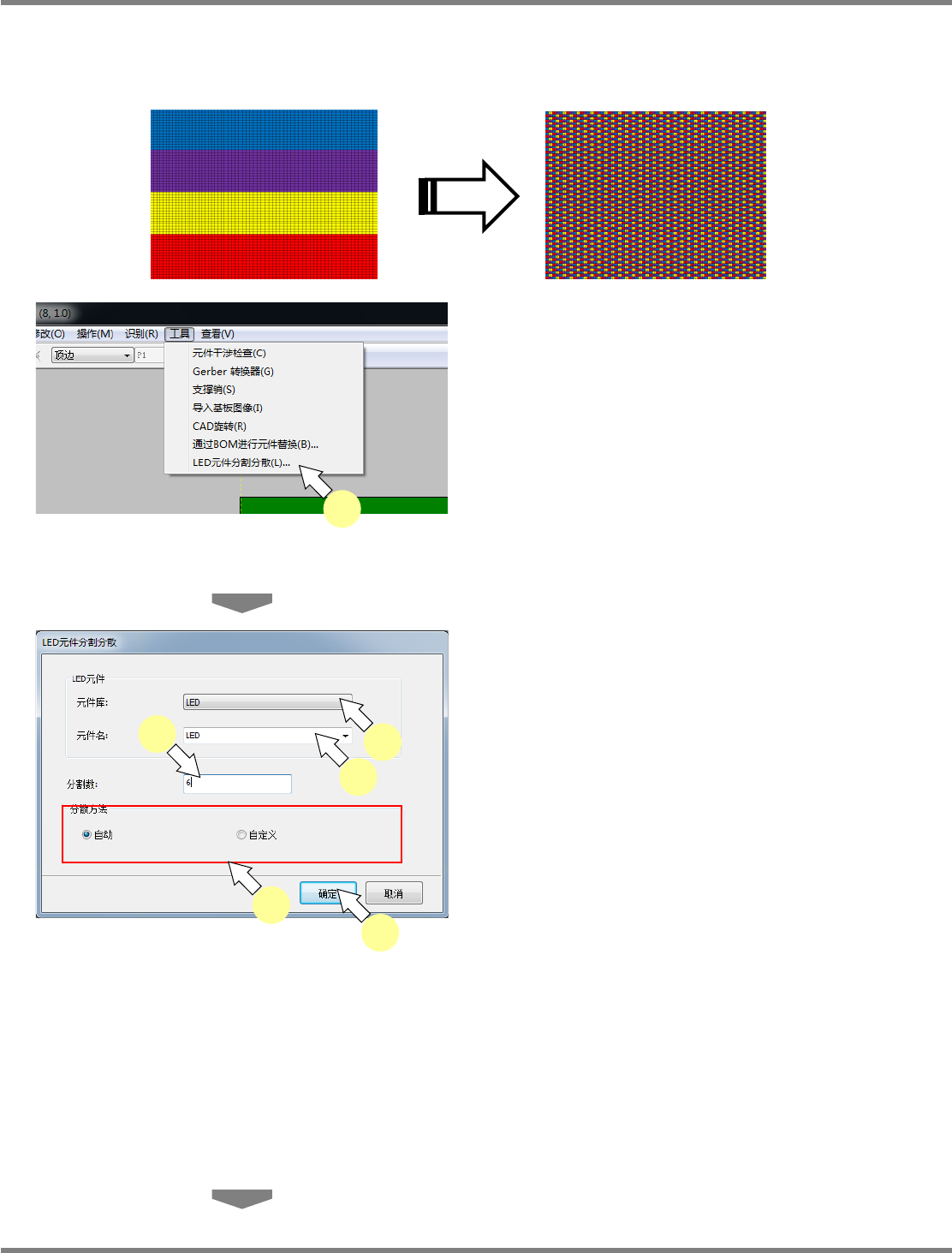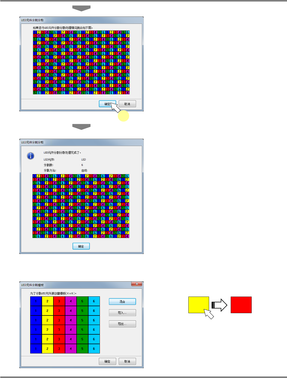 NPM-DGS 程序手册 5.8 PCB 编辑 EJS9AC-MB-05P-31 Page 5-375 6 确认 LED 元件分割 / 分散处理的结果示 意图。 7 点击 [ 确定 ] 。 8 确认已完成了 LED 元件的分割 / 分散处 理。 L E D 元件分割 / 分散处理 – 自定义 可显示指定的分割数 x 分割数表格后,任意创建模板。 点击单元格,即会对单元格中的编号 加算 1 后 变更显示颜色。 例 ) Projec…