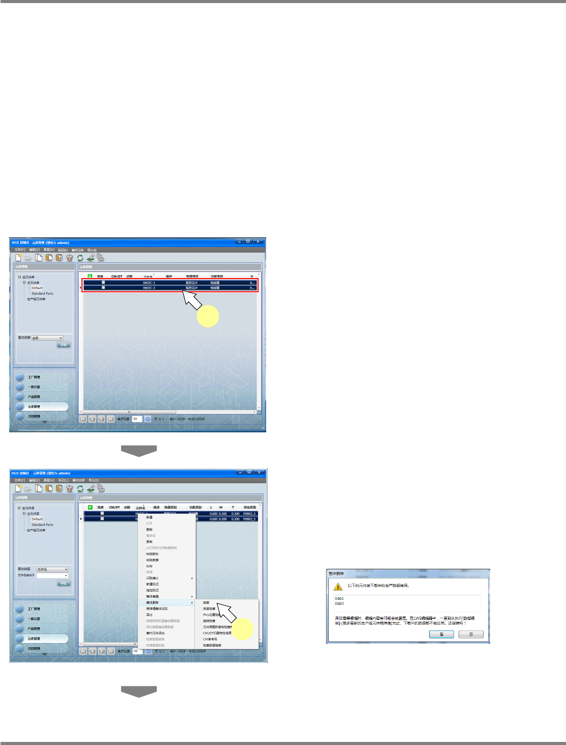 NPM-DGS 程序手册 6.7 现有元件的编辑 Page 6-212 EJS9AC-MB-06P-28 整体删除 在整体删除功能下,可对位于详细设 定菜单中的以下项目执行整体删 除操作。 容差 亮度检查 元件的正反反转用的亮度检查 中心位置检查 旋转检查 元件周围附着物检查整体设定 CM/DT 设备固有信息 CM 参考 检查数据链接 整体删除步骤 ( 例 : 容差 ) 可从元件一览中删除容差…