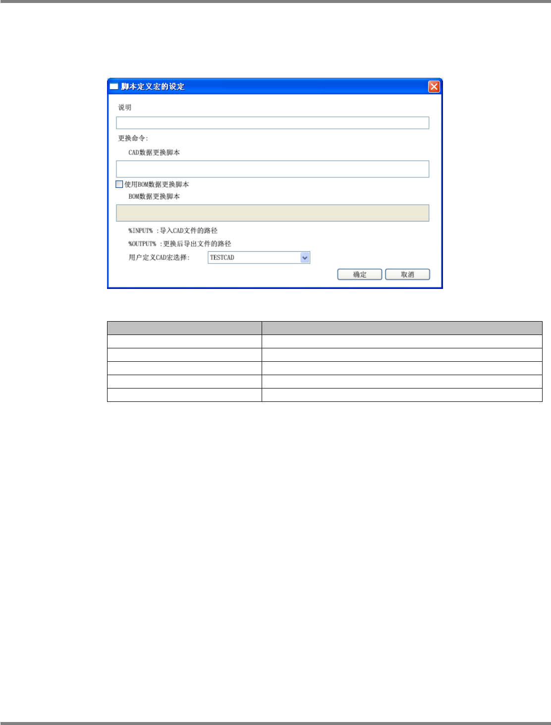 NPM-DGS 程序手册 5.2 CAD 宏的定义 EJS9AC-MB-05P-31 Page 5-77 5.2.2 脚本定义 CAD 宏 在导入在用户定义 CAD 宏下所定义的 CAD/ BOM 文件之前, 能够定义自动执行的转换脚本。 在不 能通过 CAD 宏编辑器来定义的格式下, 能够进行通过用户定义宏来 将其转换为可读取形式的前处 理。 脚本定义宏的设定项目 项目 说明 ‘ 说明 ’ 可任意输入宏的说明。 ‘CAD 数据更换…