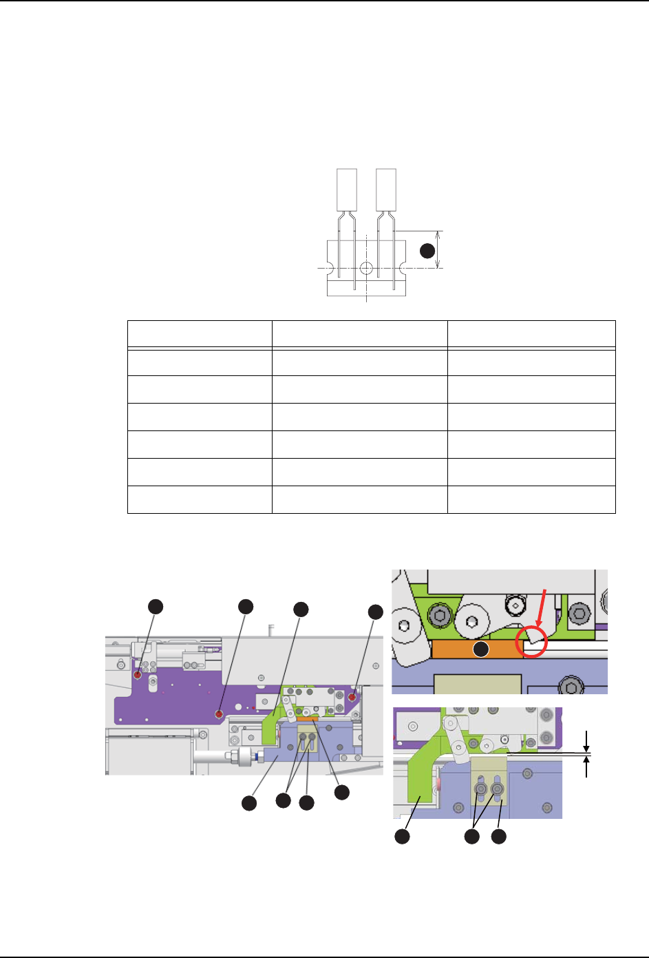 与挡块 (4) 之间插入块规 (7)。插入时请避免块规接触连动爪 ( 图中标示 )。调试送料