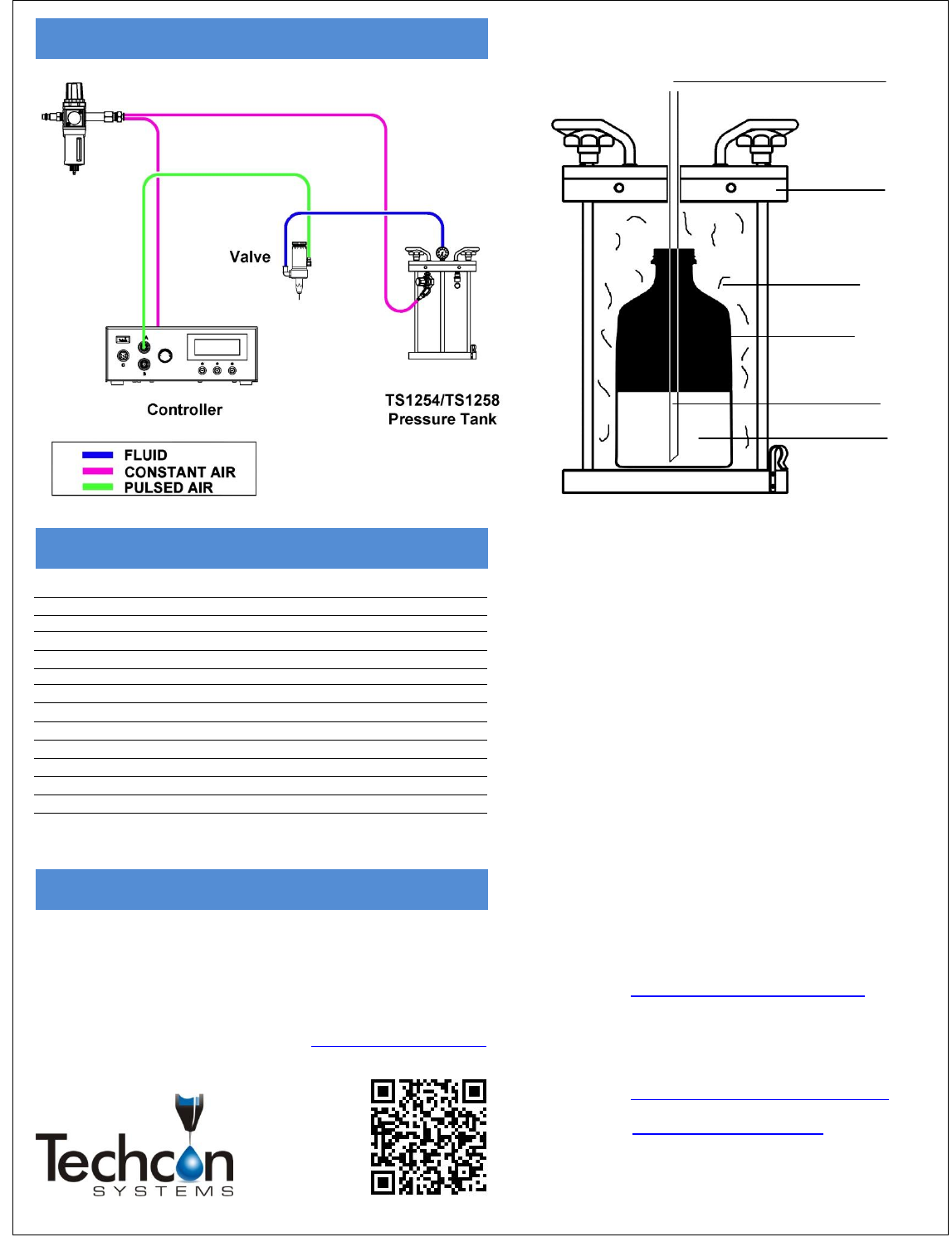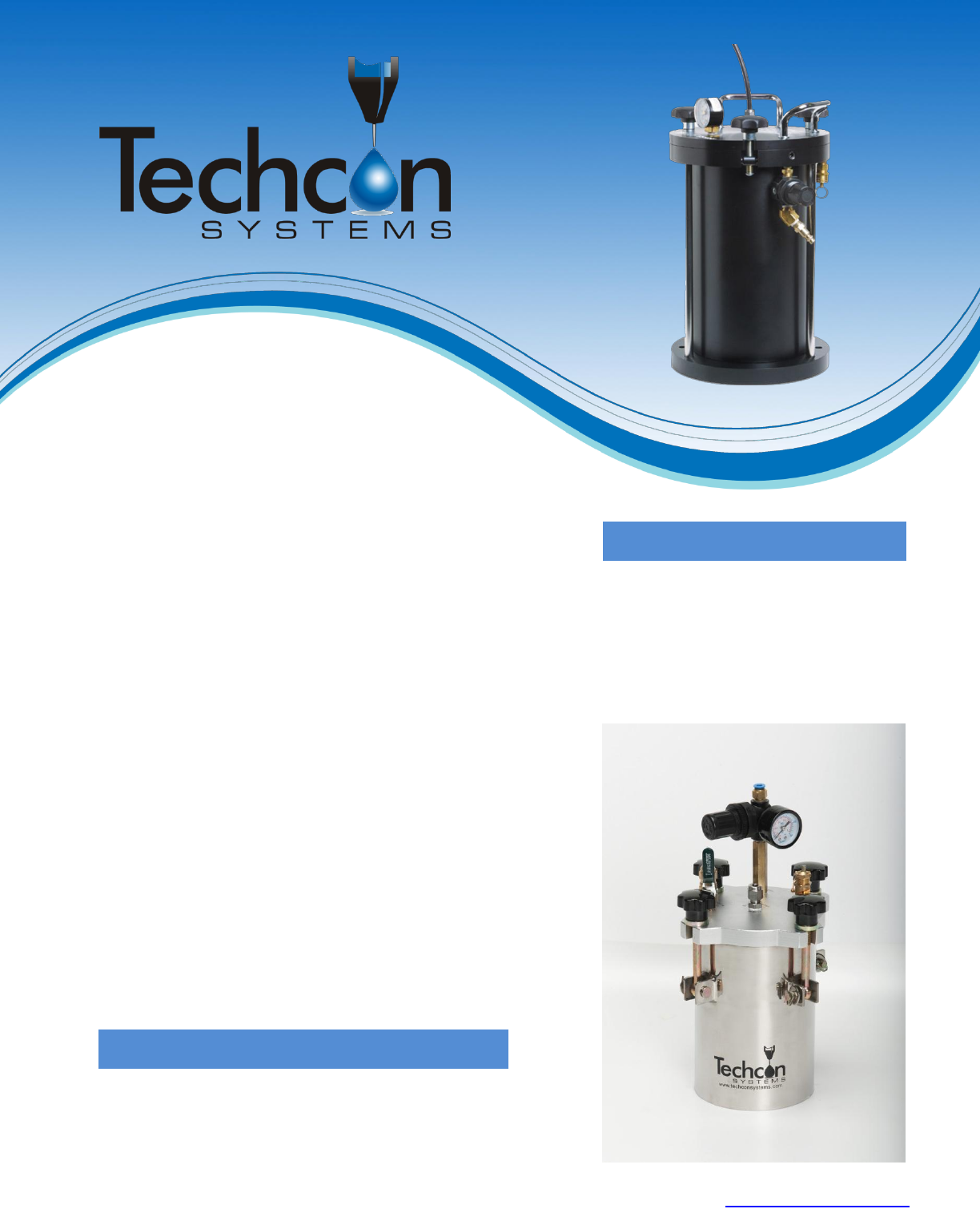 KEY FEATURES AND BENEFITS Techcon Systems pressure tanks are desig ned to accommodate fluids that are supplied in bottle/container form. Constant air pressure forces the fluid from the bottle through pre-installed tubing…
