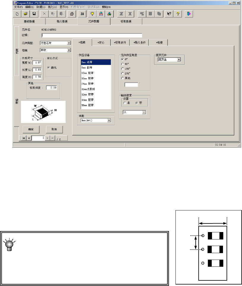 EPU 使用说明书 第 4 章 制作生产程序 4- 52 4-1-5-2-2 包装 (1) 带状的输入方法 图 4-1-5-2-2- 1 元件数据 ( 带状包装 ) 1) 供应设备 根据“包装”、 “供料器类型”的选择状 态,在列表框内显示可以 选择的供 应设备清单。 请从该列表中选 择 1 种。 2) 间距 选择带的传送间 距。 当带为 12mm ~ 72mm 时,请 根据带状供料器 的传送间 距来设置元 件数据的间距 。 例 ) 用…