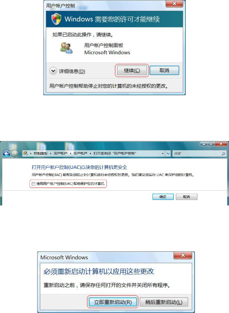 EPU 使用说明书 第 2 章 安装 2-4 ② 「用户账户控制」的提示信息对话框显示后,选择「继续」。 ③ 在「打开(或关闭)用户账户 控制」画 面中,去掉「使用用户账户控制( UAC )帮助保护您的计算机」 的勾选,点击「确定」。 ④ 显示「必须重新启动计算机以应用这些变更」的提示信息对话框,选择「立即重新 启动」 重新启动计 算 机。 ⑤ 重新启动后,请按照下一项「软件的安装」,进行必要的软件安装。 ⑥ 全部软件安装完成后,请将「…