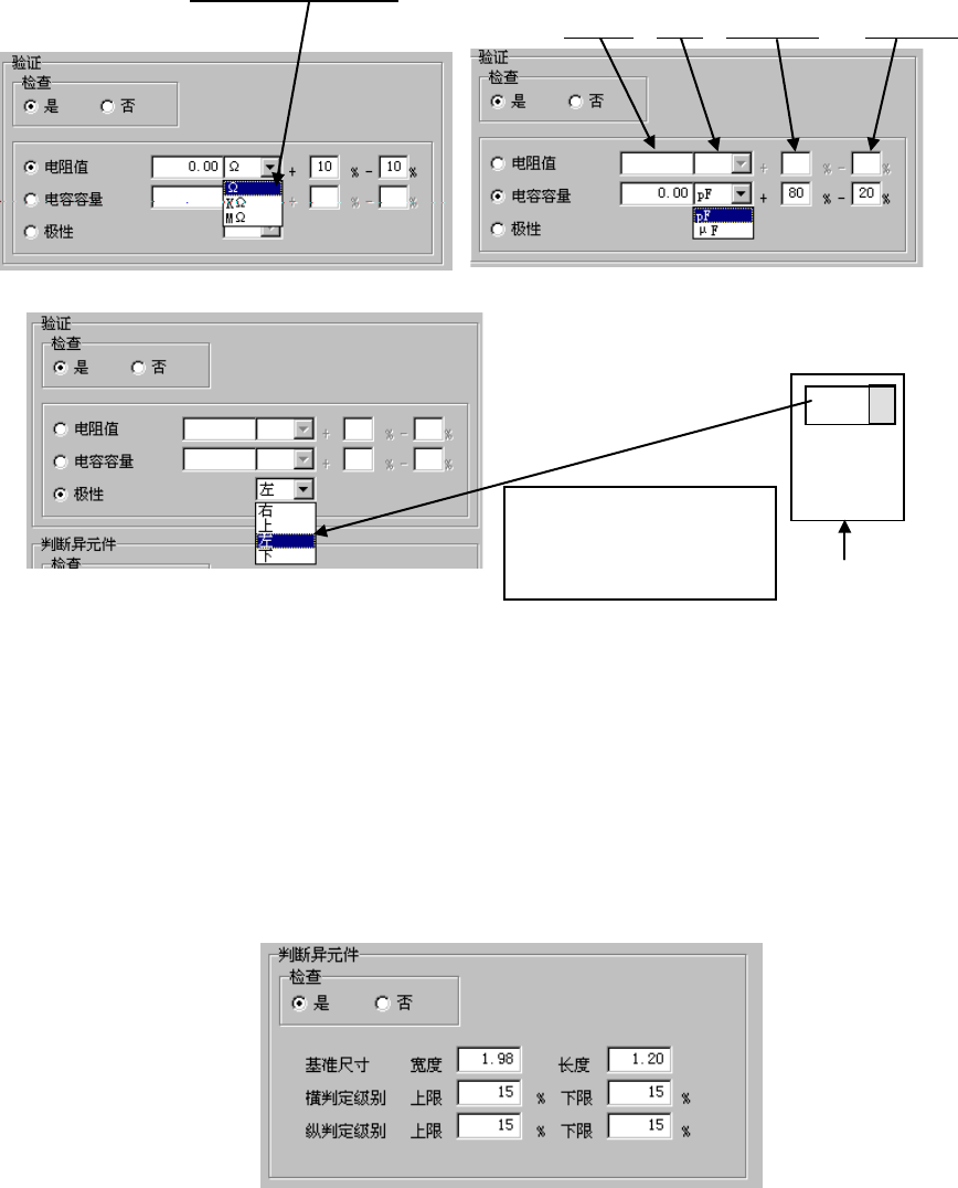 指定是否检查电阻值、电容器容量、极性,并设置其判定值。