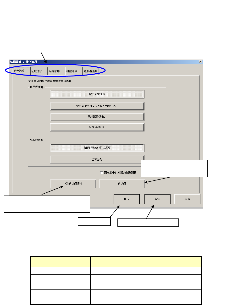 分割选项 设置分配吸嘴及吸取数据时的优化参照选项。