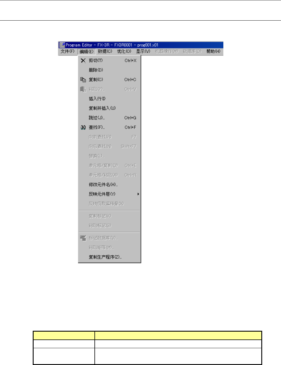 EPU 使用说明书 第 4 章 制作生产程序 4- 11 7 4-3-2 编辑 4-3-2-1 编辑菜单 该功能是制作程 序的辅助功能。 图 4-3-2-1-1 编辑菜单命令 ※ 范围选择 进行剪切或复制 时,请预先选择删除或复 制的范围,然后再进行操 作。 范围选择以行为 单位进行。 选择范围的方法 鼠标 通过拖拽,则被 选择的行呈反色显示。 键盘 按住 [SHIFT] 键的同时,按下 [ ↓ ] 或 [ ↑ ] 键,则被选择 的行呈…