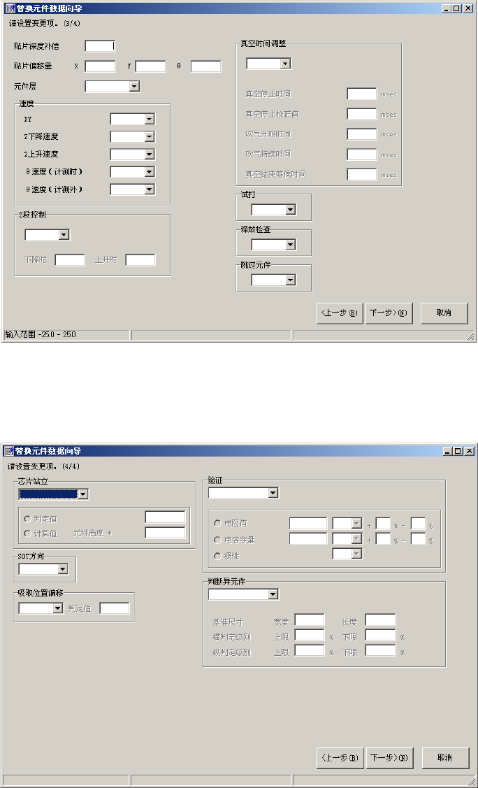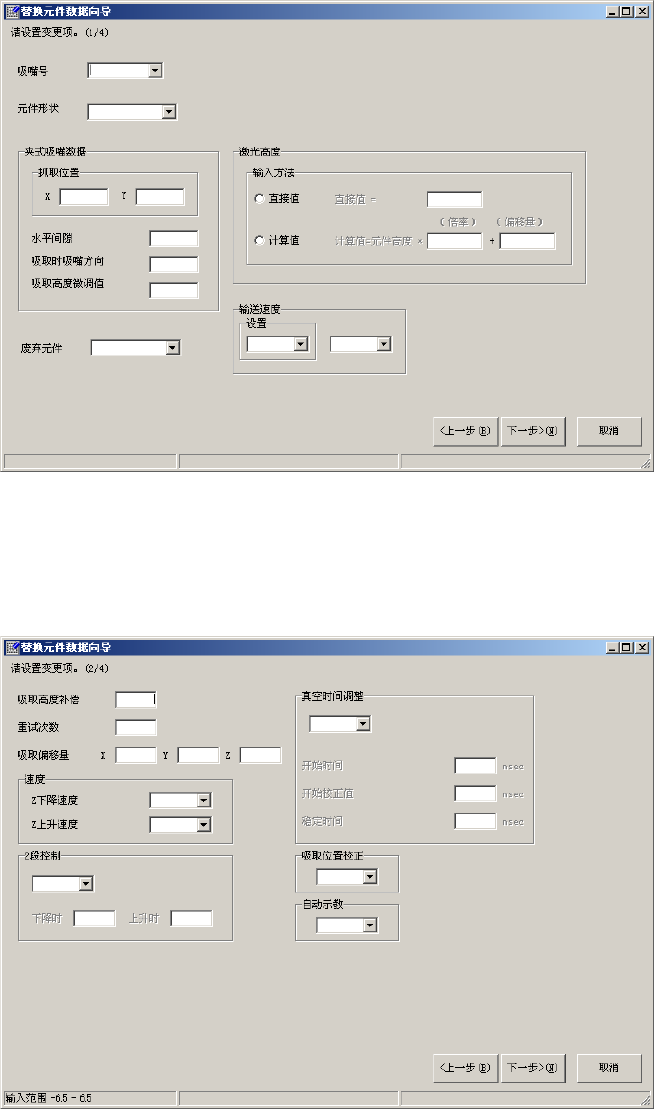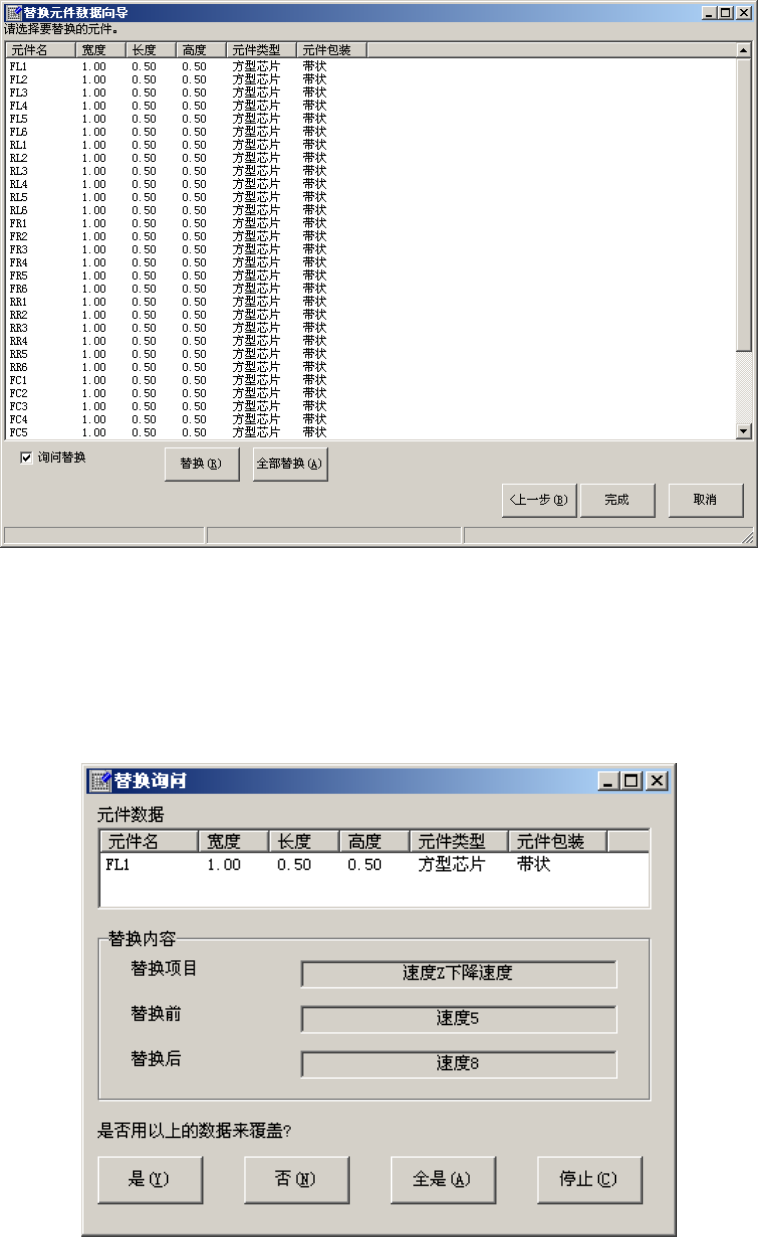 EPU 使用说明书 第 4 章 制作生产程序 4- 124 ③ 显示元件数据的 [ 贴片条件 ] 选项卡的内 容 。 设置变更项目 ,单击“下一步”。 图 4-3-2-1-13 设置替换画 面 (3) ④ 显示元件数 据的 [ 检查 ] 选项卡的内 容。 设置要变更的各 个数据的值,单击“下一 步”。 图 4-3-2-1-14 设置替换画面 (4)