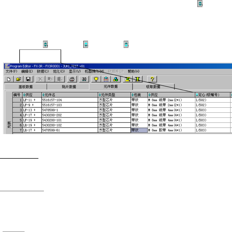 元件名称、包装状态、供给设备、供给(号码)均可做为排序键,使之显示出排序数据。