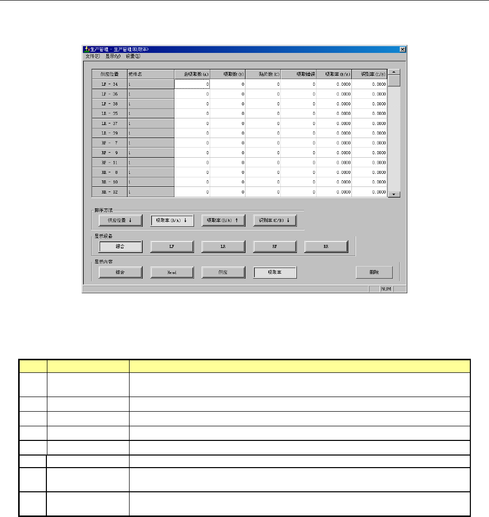 EPU 使用说明书 第 4 章 制作生产程序 4- 146 排序方法:选择 列表排序方法。 No. 项目 内容 1 供给位置 ↓ 按供应位置的升序显示。 2 吸取率( B/A )↓ 按吸取率的最差顺序显示。 3 吸取率( B/A )↑ 按吸取率的最佳顺序显示。 4 识别率( C/B )↓ 按识别率的最差顺序显示。 显示设备:选择 列表显示的有元件的供料 器台架。 No 项目 内容 1 LF (左前) 只显示设置在 LF (左前)的元件。…