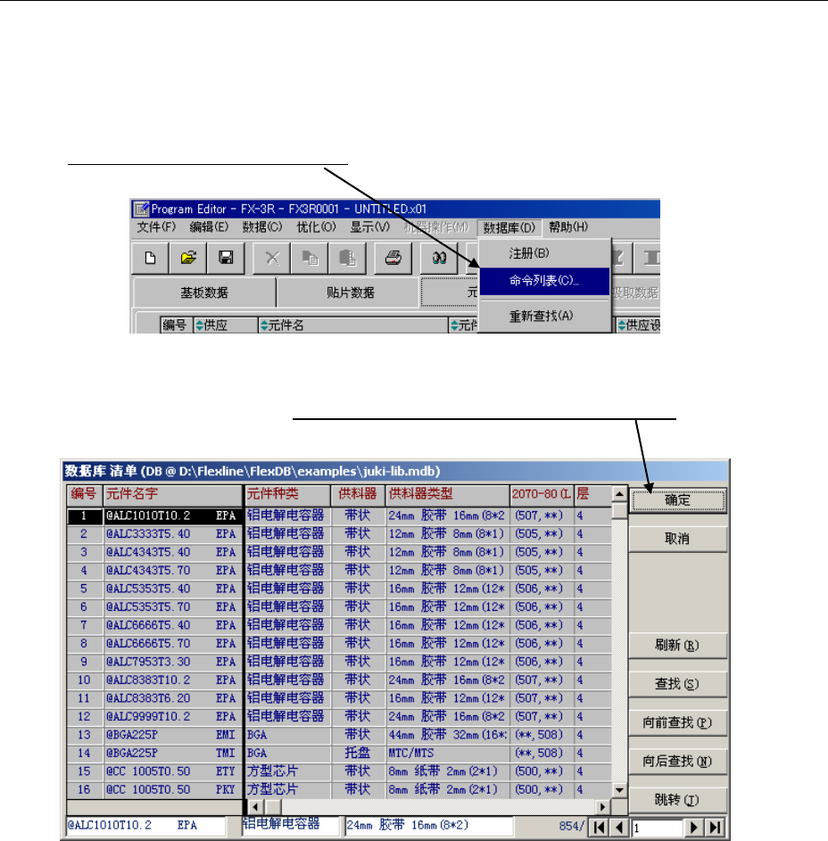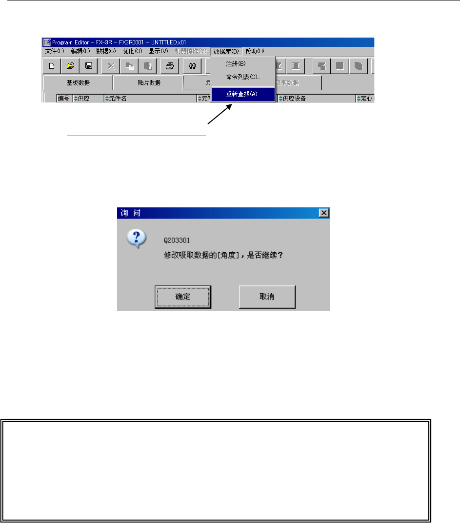 E PU 使用说明书 第 5 章 数据库 5-5 5-1-3 当在已贴片数据中输入了元件名时 如果数据库中已 经注册了“贴片数据”的 元件名,将数据库的元件 数据统一 注册到程序。 ( 重新查找※ 1 功能 ) 单击“数据库” / “重 新查找” 图 5-1-3- 1 重新查找画面 点击重新查 找,显示如下对话框。 图 5-1-3- 2 吸取数据的“角 度”变更信息 在此选择“确 定”,则更新 吸取角度。 选择“取消” 则不…