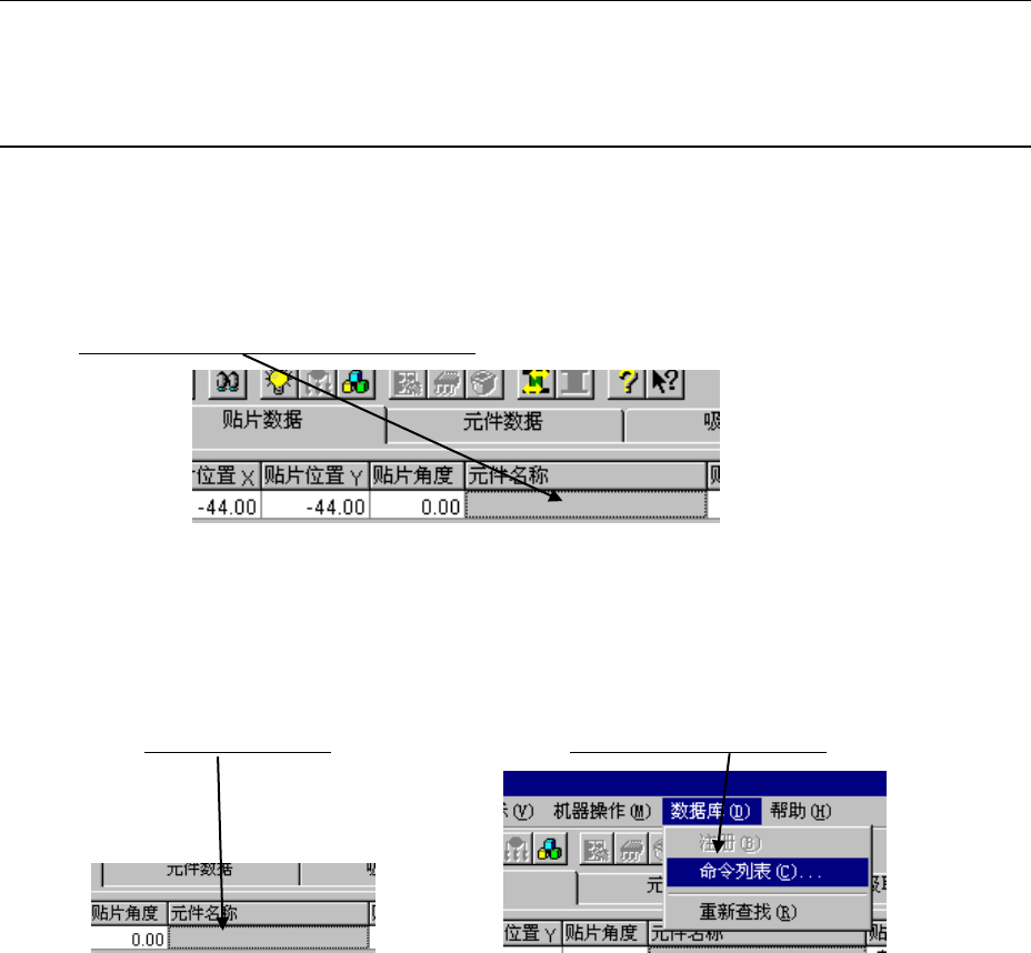 ① 请单击空白的元件名称栏。 ② 请单击“数据库”/“命令列表”。