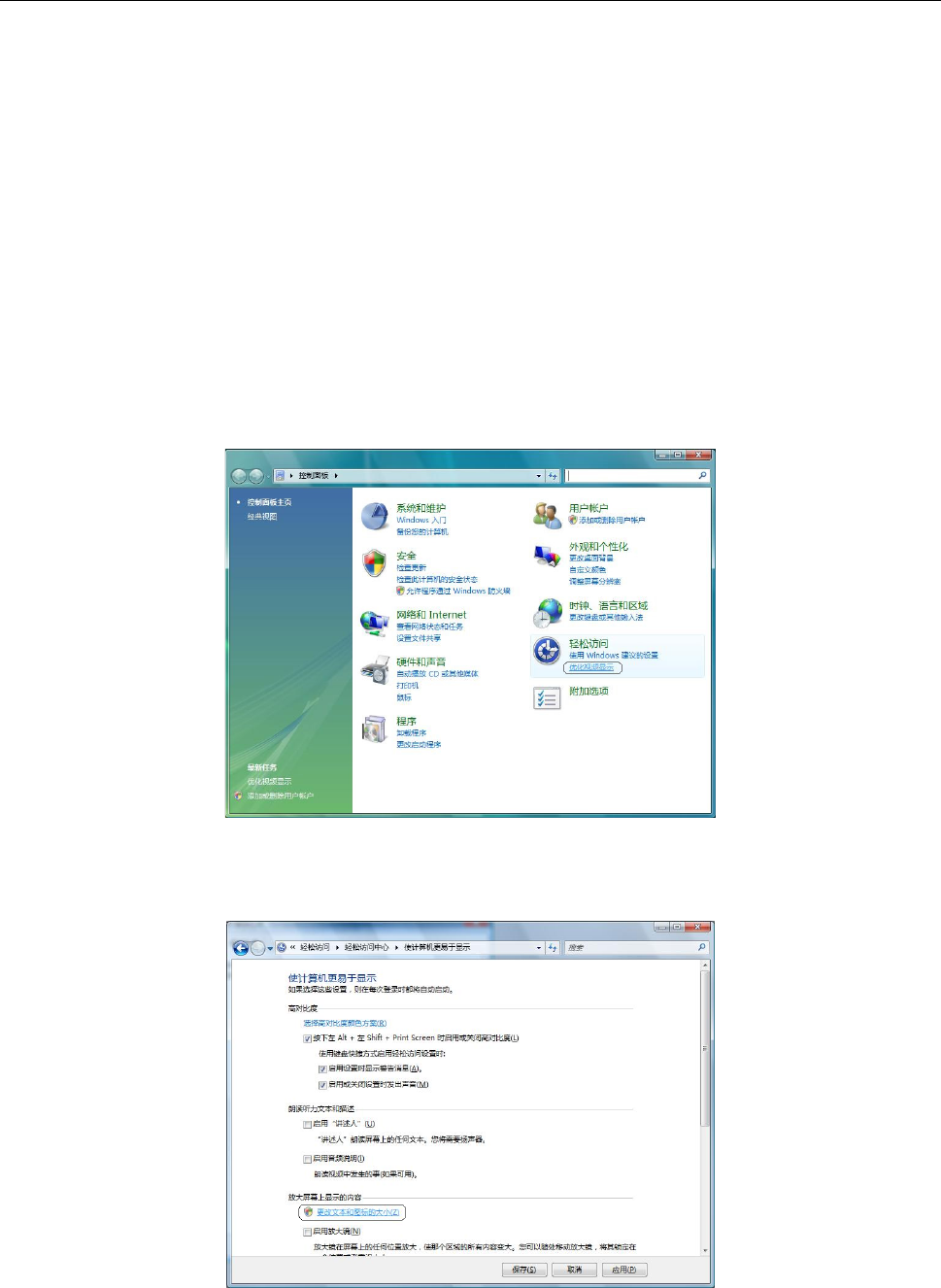 ① 在控制面板中,选择“电脑的简单操作”-“视觉显示的优化”。