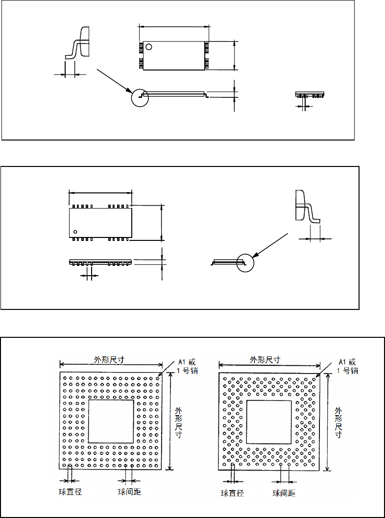 附录 A-5 · TSOP-1 引脚长度 外形尺寸 纵 外形尺寸 横 引脚间距 元件高度 + · TSOP-2 引脚长度 外形尺寸 纵 外形尺寸 横 引脚间距 元件高度 + · BGA 、 FBGA( 仰视图 ) 一般配置型 交错配置 型