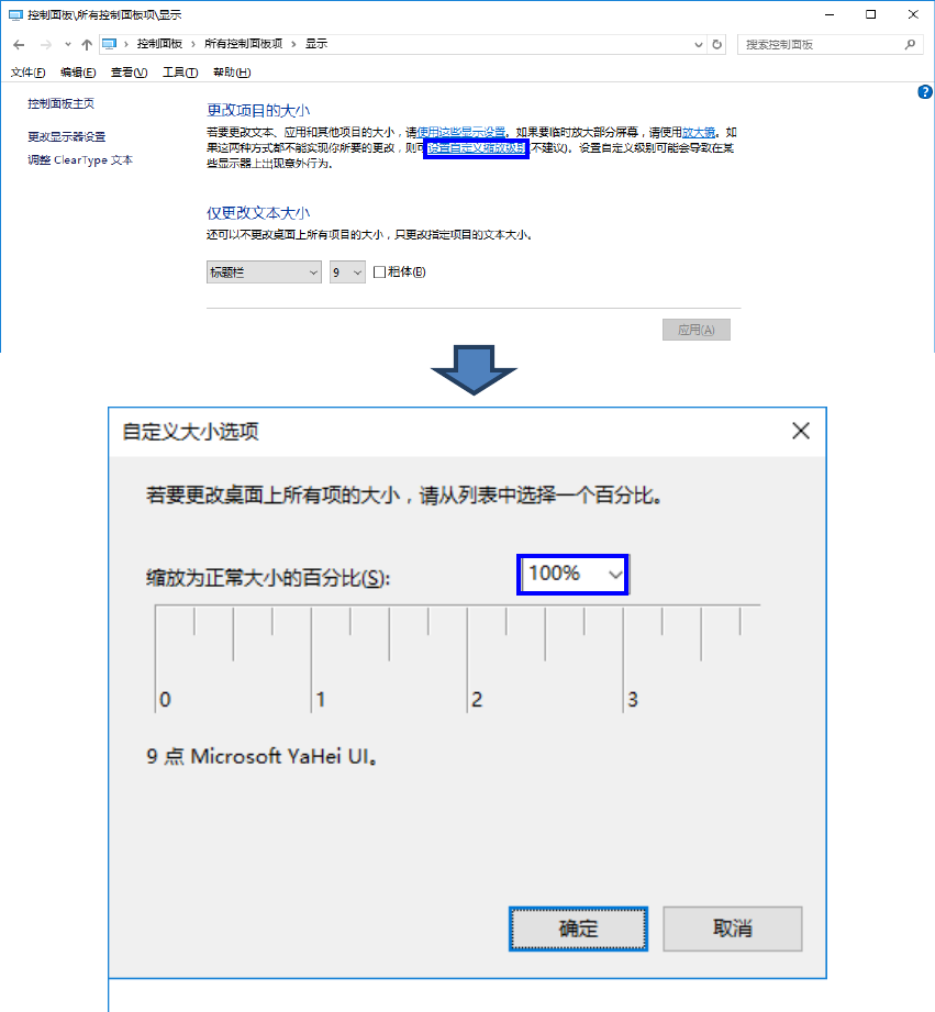 如果是 Windows10,请选择“设置自定义缩放级别”,选择“100%”,点击确定。