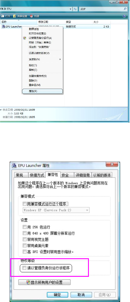 EPU 使用说明书 第 2 章 安装 2- 18 (2) 应用程序(快捷键)属性的设置方法 由于要使用 EPU Launcher ,必须确认属性。 请在安装后的初次设置时对以下设置进行确认。 ① 右键点击“ EPU ”启动程序的快捷键,选择属性。 图 2- 3- 2- 2- 1 属性设置选择画面 ② 请确认“兼容性”画面上的“请以管理员身份运行该程序”未被勾选。 图 2- 3- 2- 2- 2 EPU Launcher 属性设置画面
