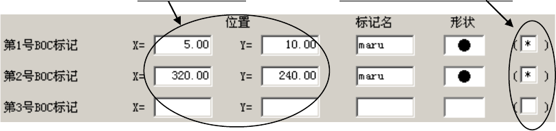 输入 X、Y 坐标。 选择此处,示教标记形状。