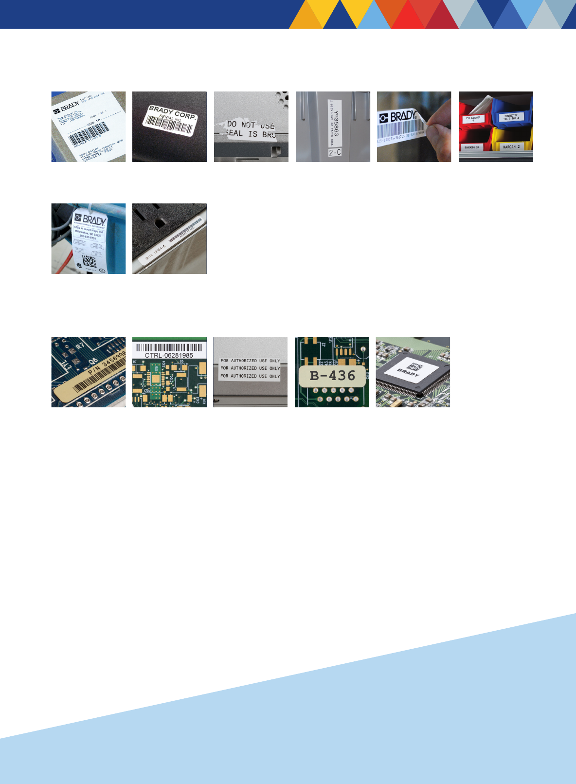 电子和 PC 板应用 耐高温聚酰亚胺标签 聚酯标签 防静电标签 PC 板组件标签 可移除聚酰亚胺标签 物流、一般工业和资产 ID 应用 纸标签 防揭换和防篡改标签 资产追踪标签 聚酯标签 箱架标签 装运物和托盘标签 可重贴标签 吊牌纸卡 www.br ady.com.cn 9