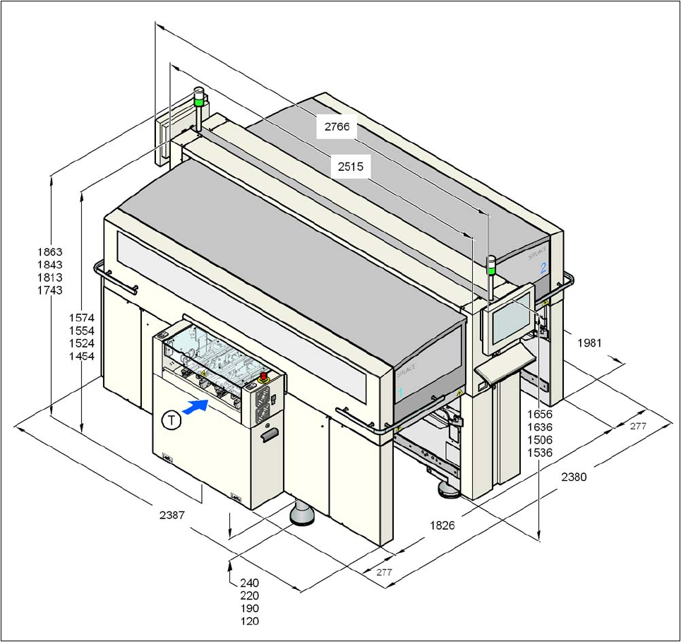 Instrucciones de servicio SIPLACE Serie-X 3 Datos técnicos de la máquina automática A partir de la versión de software SR.605.xx 3.3 Dimensiones y peso Edición 07/2008 ES 113 3.3.2.2 Dimensiones de la máquina a utomática…