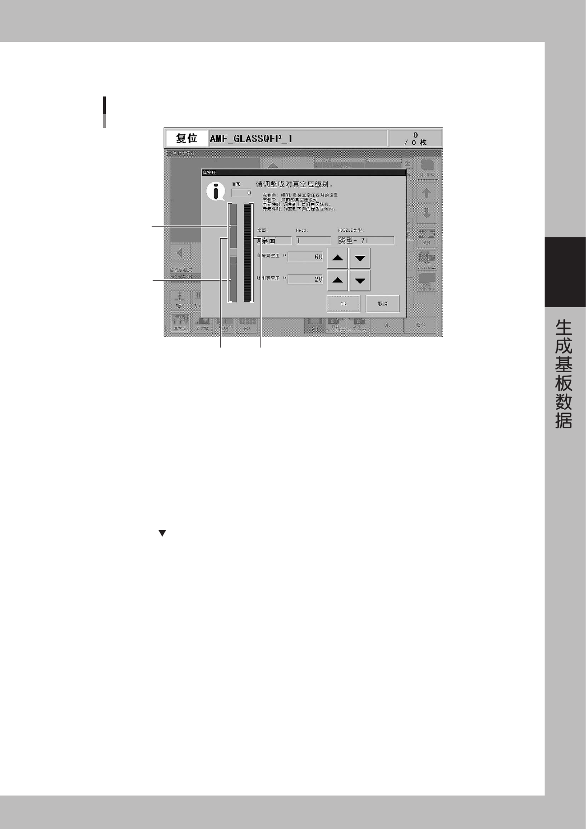 吸附的 [ ] 按钮调整,直至进入下侧绿色部分。确认、调整作业完成后,请解除紧急停机按钮,再按