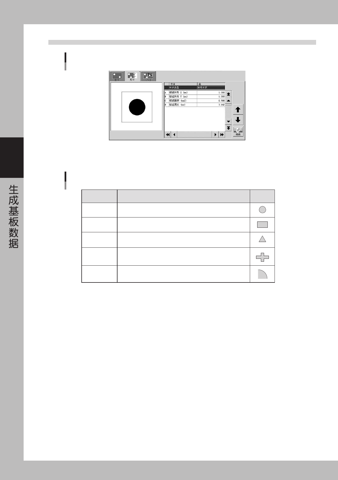 3-67 3 B : 标 记 外 形 请 输 入 标 记 的 外 形 尺 寸 。 请 参 照 下 表 输 入 用 圆 规 等 测 得 的 正 确 数 值 。 基 本 参 数 的 「 标 记 功 能 」 设 置 为 「 坏 板 标 记 」 时 , 该 参 数 不 显 示 , 而 「 标 记 检 出 范 围 」 被 显 示 。 例 标记外型 形状类型 X X Y Y 请输入直径的长度 请输入各边长 请输入一条边的边长 请在「标记外形X」中输…