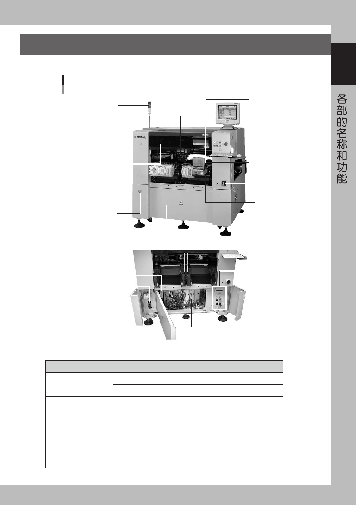 1-1 1 1 . 主 机 本 节 就 主 机 的 主 要 部 分 的 名 称 和 功 能 作 具 体 说 明 。 安 装 完 毕 的 标 准 机 器 的 构 成 如 下 图 所 示 。 指示灯 正面面板 主控开关 贴装头部 送料器安装部 面板内部 控制器 安全机罩 操作·输入部 压力显示器 CD-ROM 驱动器 供气/排气开关 蜂鸣器 主机 25 1 00 - E0 -0 0 ■ 操 作 手 册 中 的 分 类 分 类 机 种 名 规…