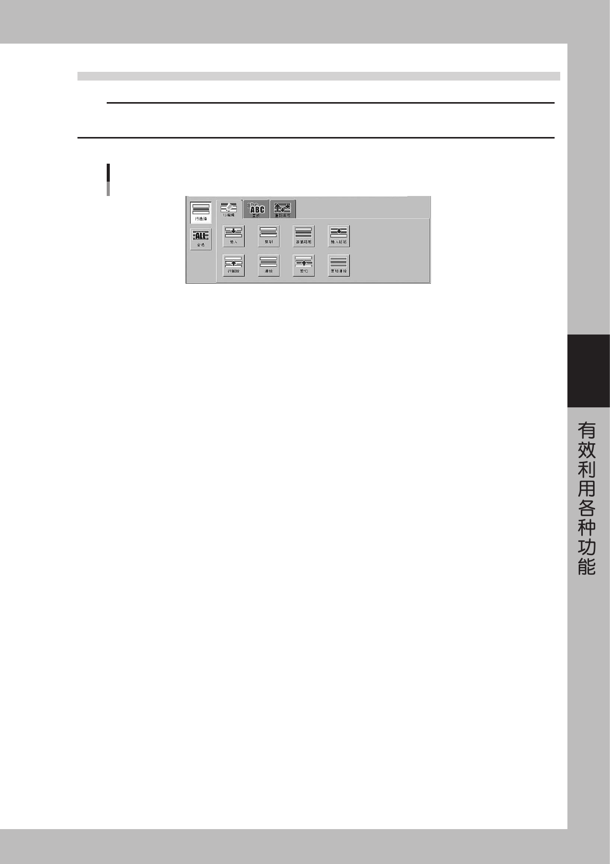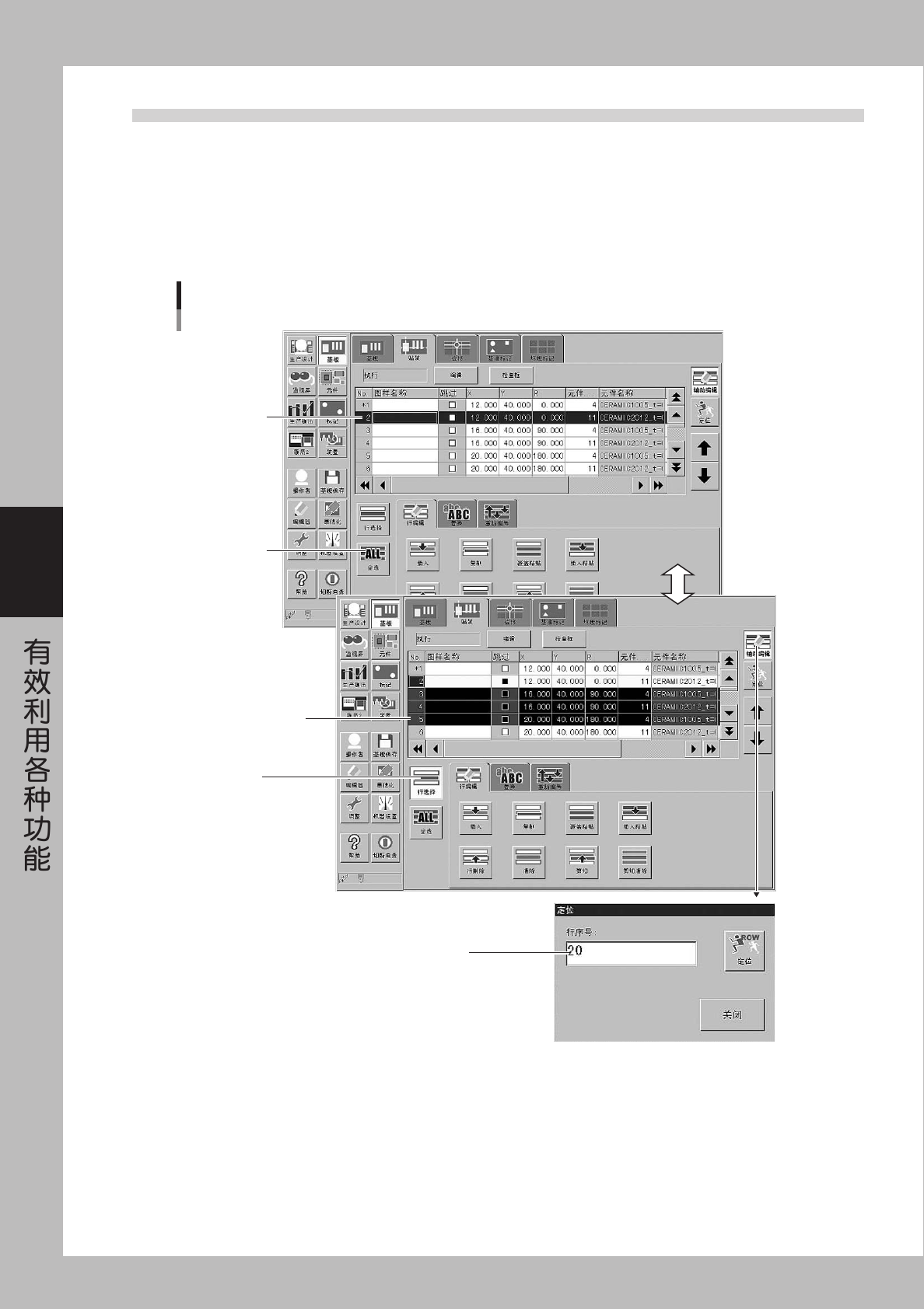 4-18 4 5 . 2 选 择 范 围 的 指 定 在 表 格 中 以 行 为 单 位 指 定 选 择 范 围 时 , 请 使 用 「 行 选 择 」 按 钮 和 「 全 选 」 按 钮 。 选 择 的 行 被 抹 黑 并 显 示 在 画 面 上 。 ■ 行 选 择 · 范 围 选 择 的 开 始 位 置 请 在 按 钮 没 有 下 沉 状 态 下 选 择 。 · 接 着 请 按 「 行 选 择 」 按 钮 后 点 击 选 择 范 围…
