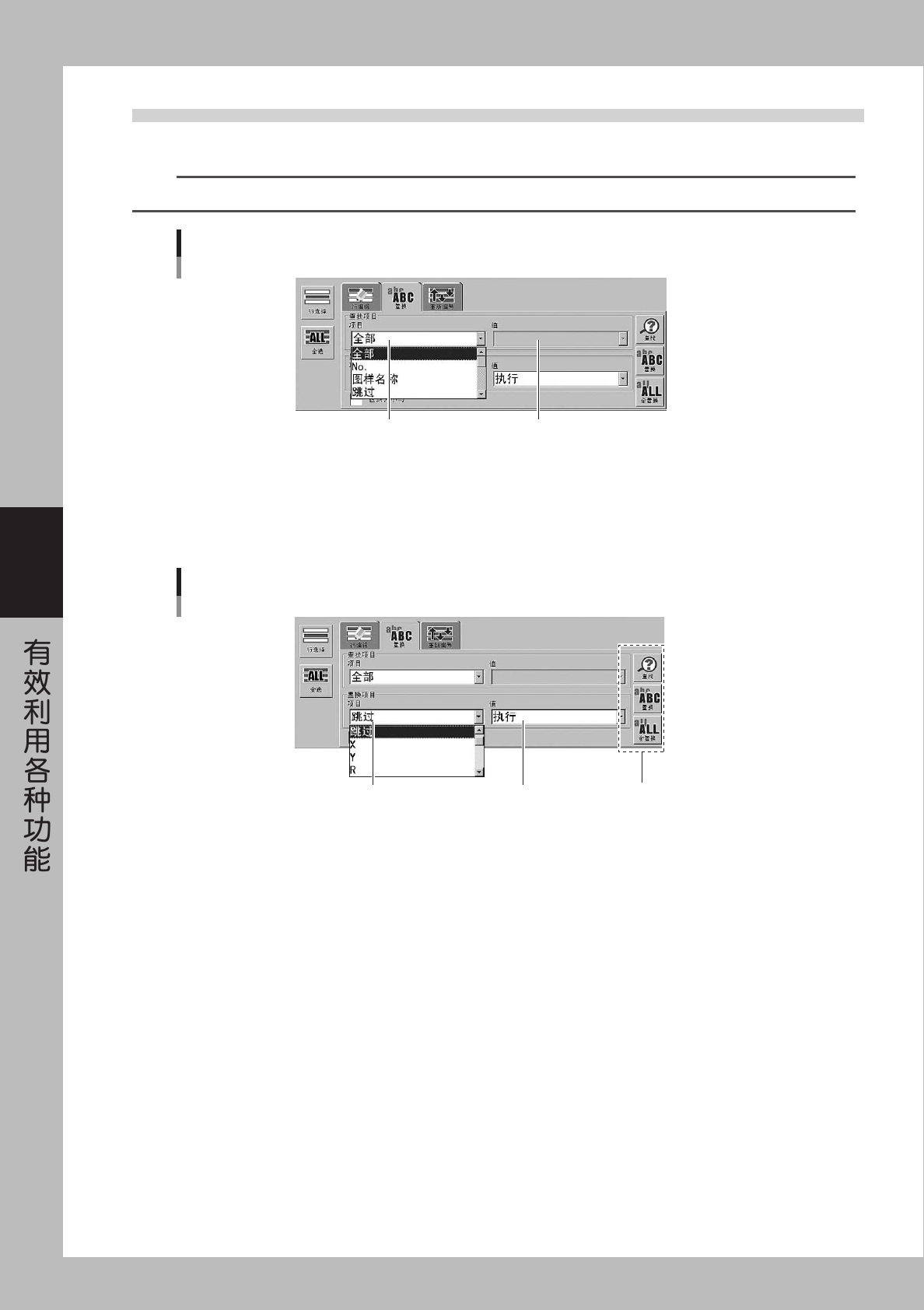 指定查找项目。「ALL」指选择范围的所有数据条件一致的特殊项目。一般在无条件置换选择范围内的数据时使用。