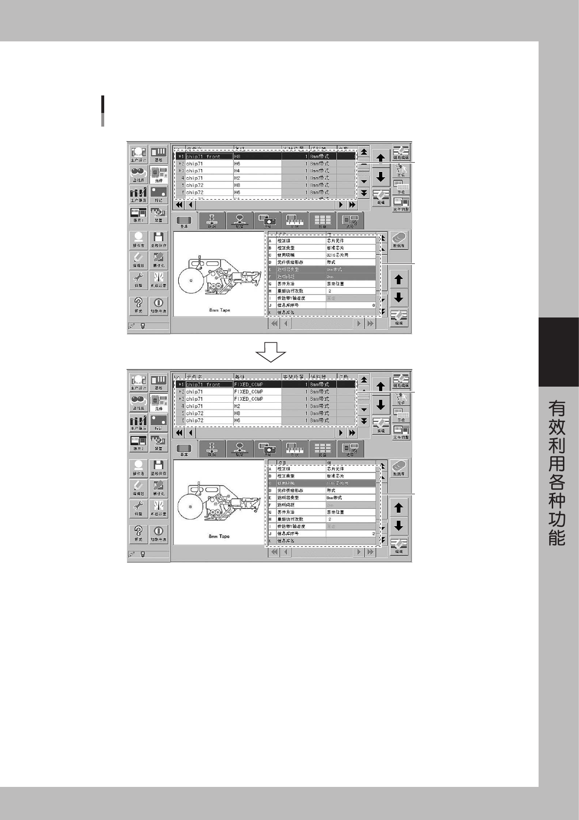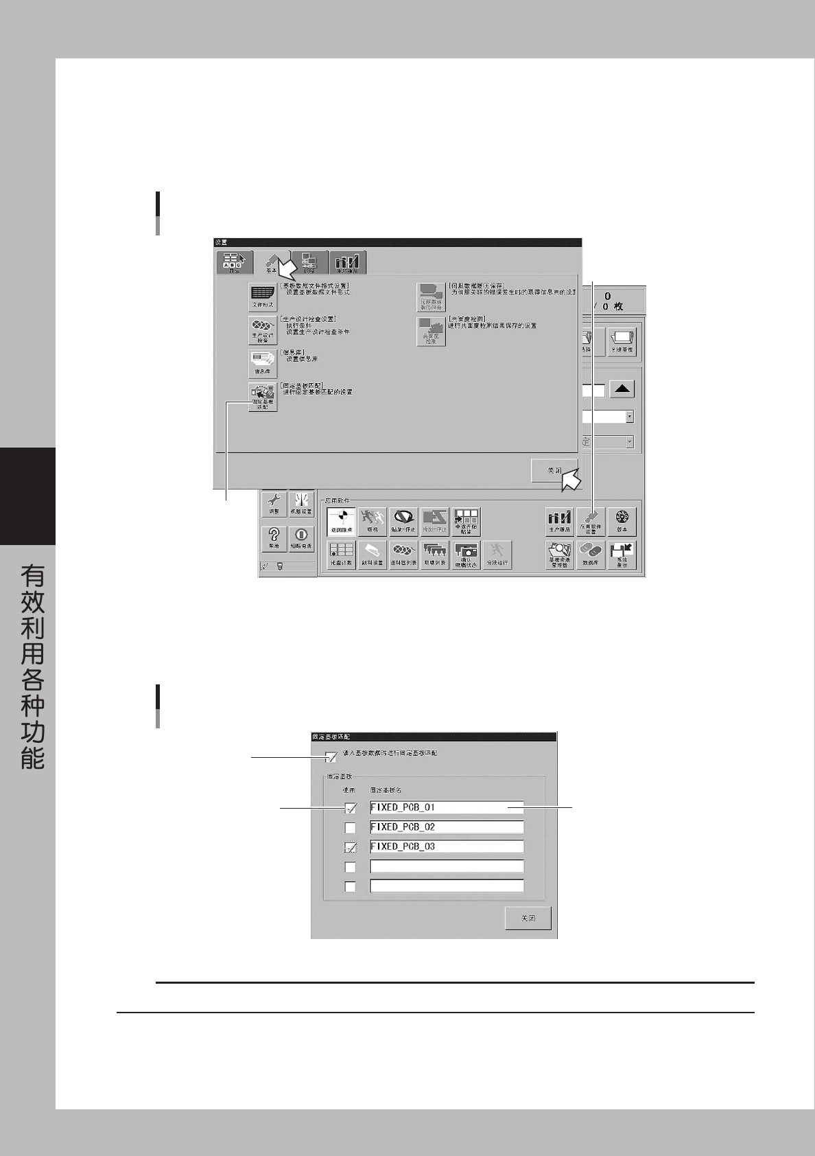 4-26 4 3 打 开 设 置 对 话 框 。 请 按 生 产 设 计 画 面 的 [ 应 用 软 件 设 置 ] 按 钮 , 打 开 设 置 对 话 框 。 4 打 开 固 定 基 板 匹 配 画 面 。 请 按 设 置 对 话 框 中 基 本 图 标 的 [ 固 定 基 板 匹 配 ] 按 钮 。 请按该按钮 [应用软件设置]按 钮 [固定基板匹配]按钮 26 4 20 - E0 -0 0 5 登 录 要 登 录 的 基 板 名 …