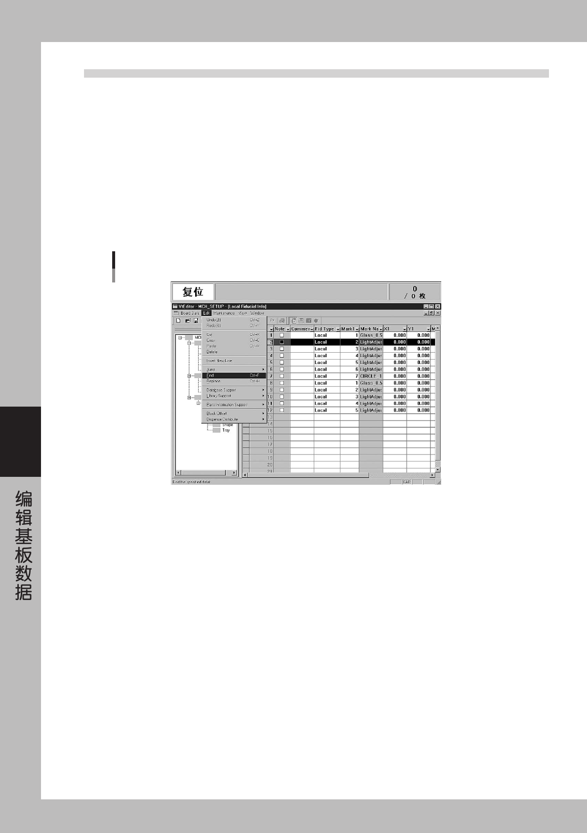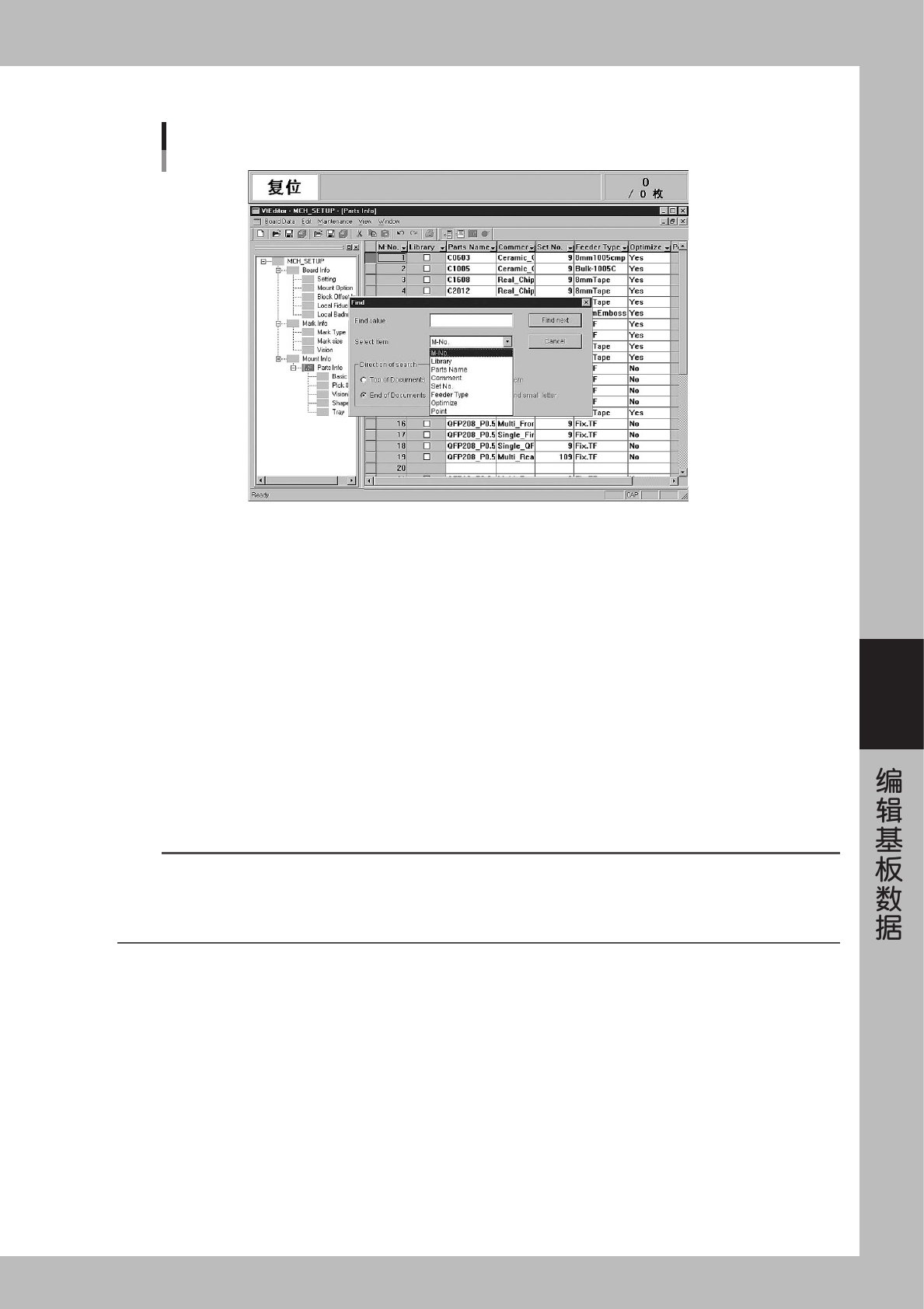 从主画面显示项目可以查找、置换相应的项目。查找、置换可以在贴装信息、位移信息、基准标记、坏标记、元