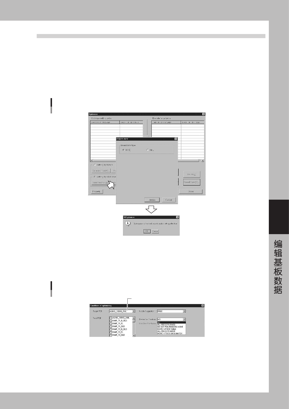 5-22 5 ■ 选 择 X M L 形 式 1 . 按 [ N e w P c b ( I ) . . . ] 按钮 , 显 示 「 C o n d i t i o n o f o p t i m i z i n g 」 画 面 。 2 . 按 [ S e l e c t ] 按 钮 , 从 文 件 夹 中 选 择 最 优 化 基 板 。 XML基板的选择 26 5 28 - E0 -0 0 4 选 择 固 定 基 板 。 固 定 基…