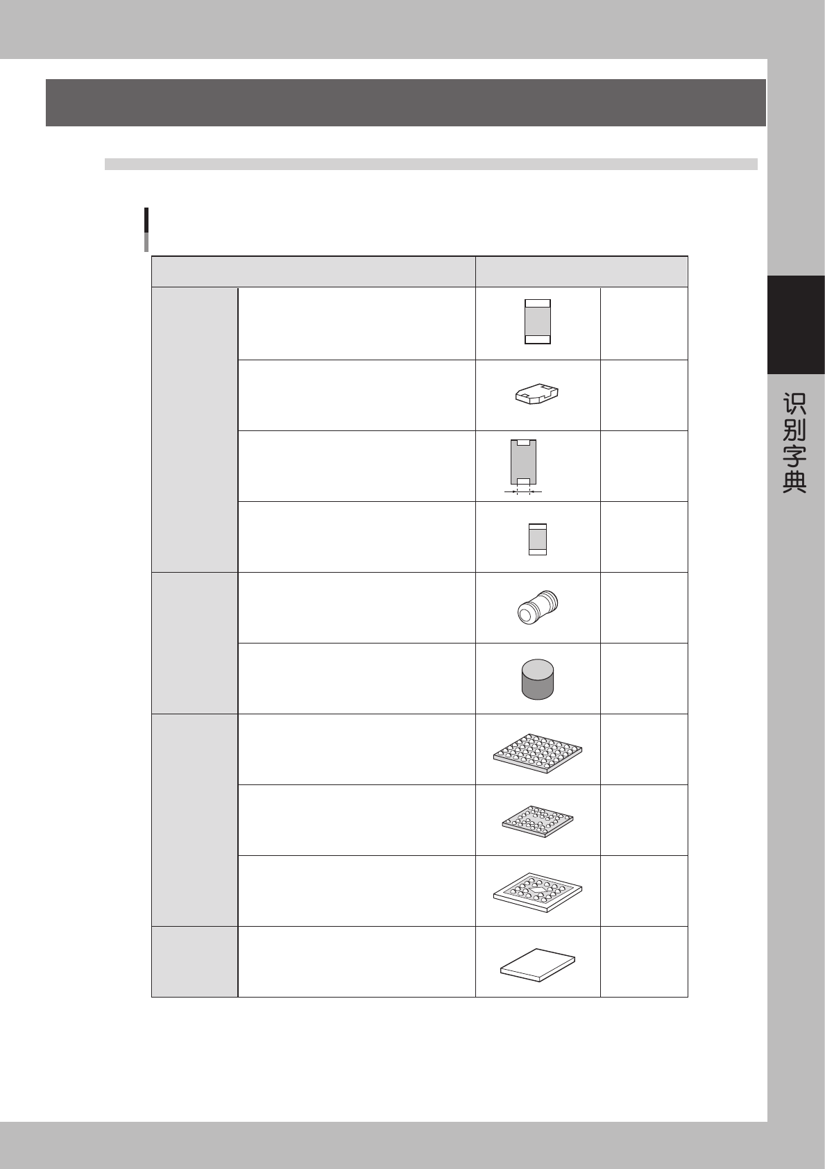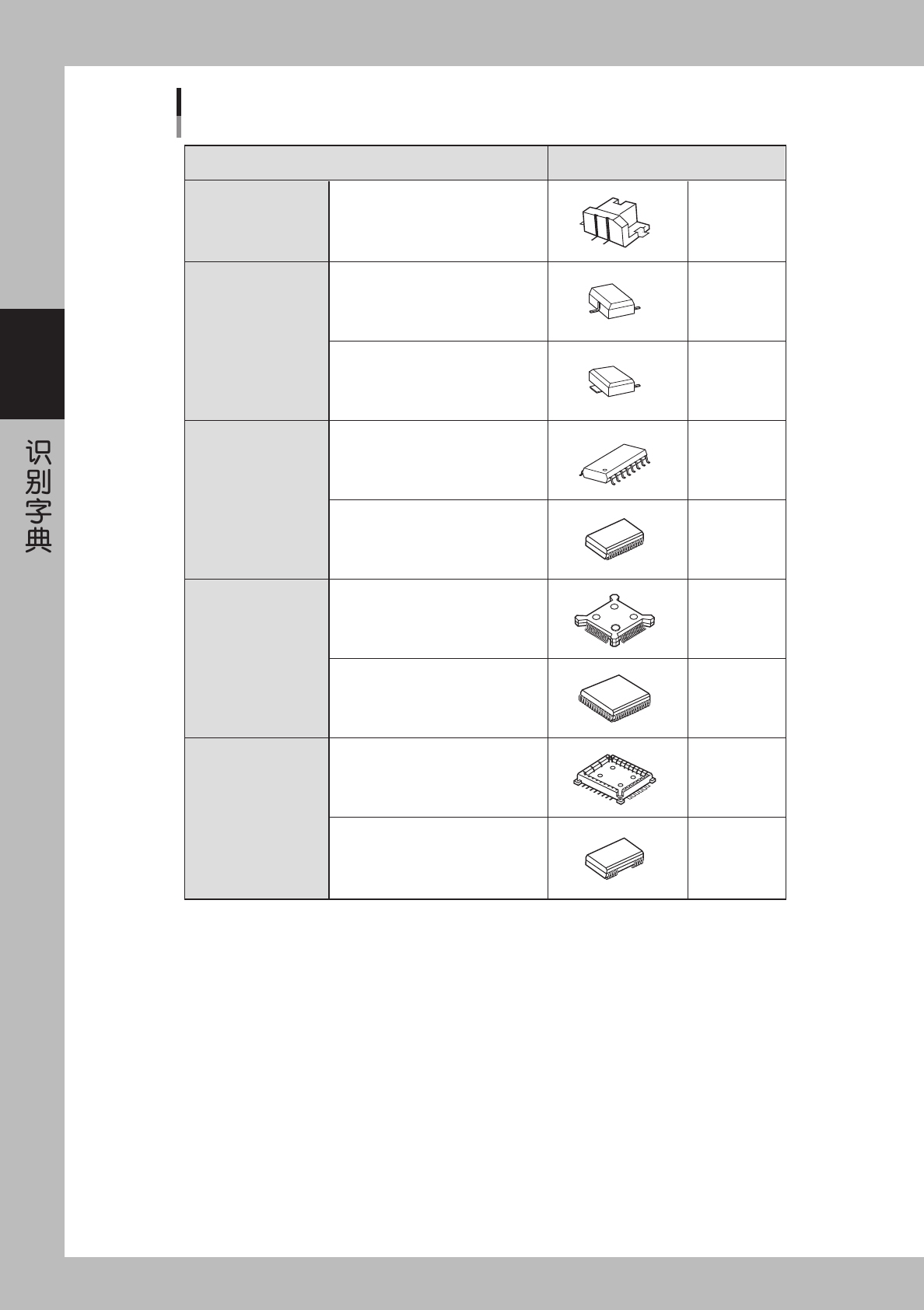 B-2 8 元件类型 校正类型 接插件E 微型Tr/SOT P-Tr SOP SOJ QFP PLCC 接插件NSEW 引脚缺损 由一个方向构成的 引脚突出 由二个方向构成的引脚中 相对面的引脚数不同 由二个方向构成的引脚中 相对面的引脚数相等 由四个方向构成的引脚中 相对面的引脚数相等 由四个方向构成的引脚中 相对面的引脚数不同 由一个方向构成的引脚突出 相对面的引脚形状相等 相对面的引脚形状不同 引脚超出了铸模的外侧 引脚没有超出铸…
