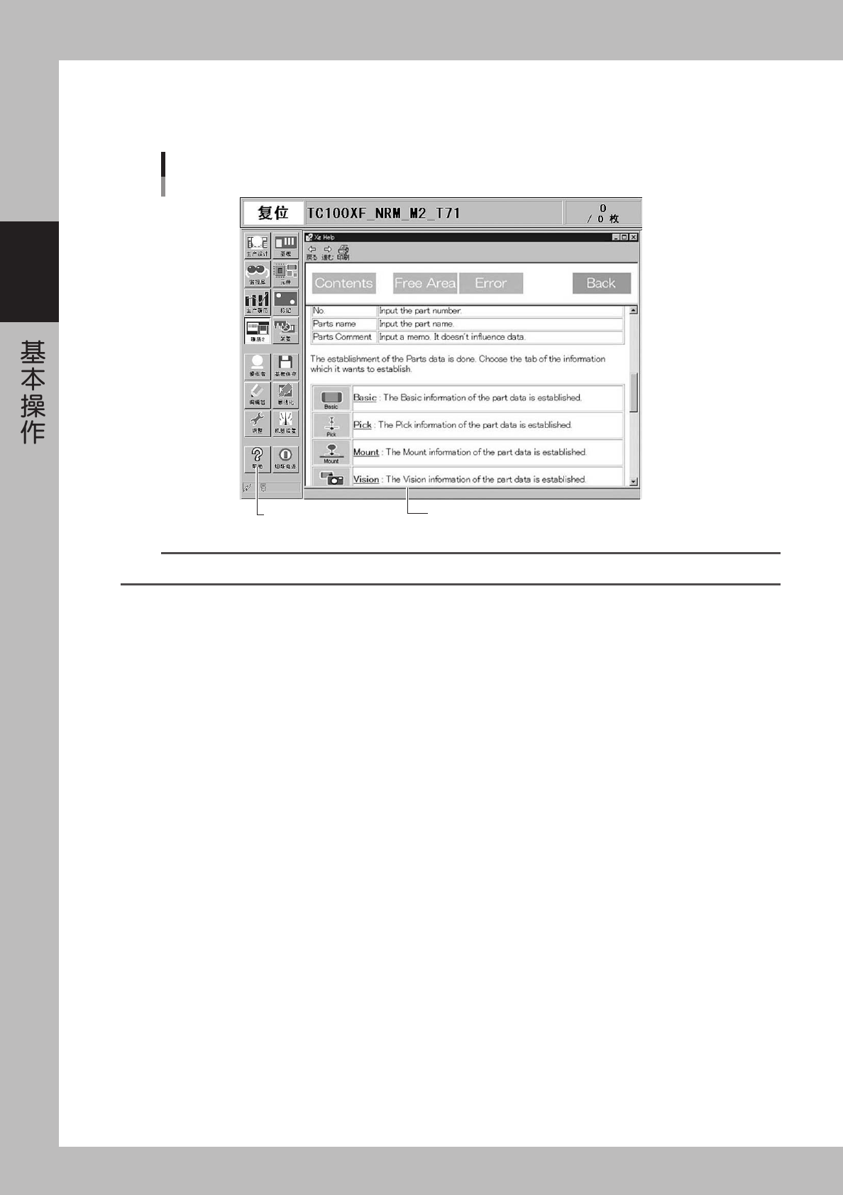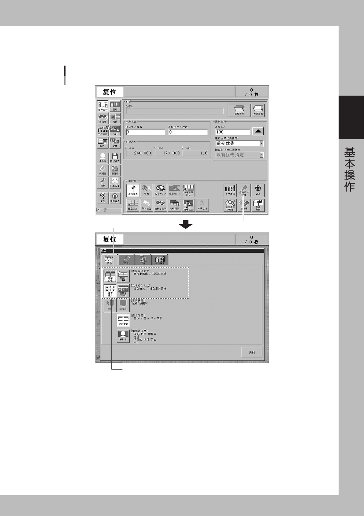 2-5 2 关 于 输 入 方 法 的 切 换 按 生 产 设 计 画 面 的 [ 应 用 软 件 设 置 ] 按 钮 , 4 个图 标 被 显 示 。 选 择 其 中 的 「 显 示 」 图 标 便 可 打 开 输 入 方 法 的 设 置 画 面 。 既 可 选 择 用 鼠 标 和 键 盘 直 接 输 入 的 方 法 , 也 可 选 择 通 过 编 辑 对 话 框 输 入 的 方 法 。 [应用软件设置]按钮 「显示」图标 选择输入方…