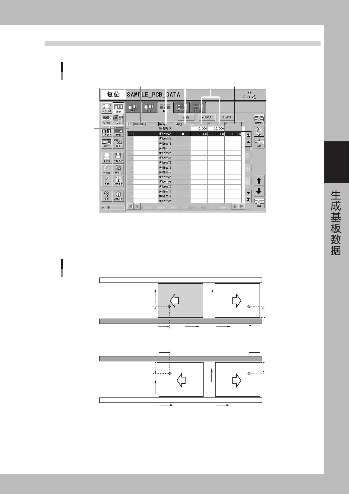 3-1 1 3 3 . 3 位 移 参 数 位 移 参 数 中 需 设 置 以 基 板 原 点 为 主 , 同 类 复 数 基 板 集 中 在 一 起 形 成 「 拼 块 基 板 」 的 基 准 块 的 位 移 数 据 。 2 1 3 4 5 6 位移参数画面 26 3 08 - E0 -0 0 1 . 基 板 原 点 在 参 数 一 览 表 的 第 一 行 输 入 基 板 原 点 的 XY 坐 标 。 以 传 送 带 前 侧 为 基 …
