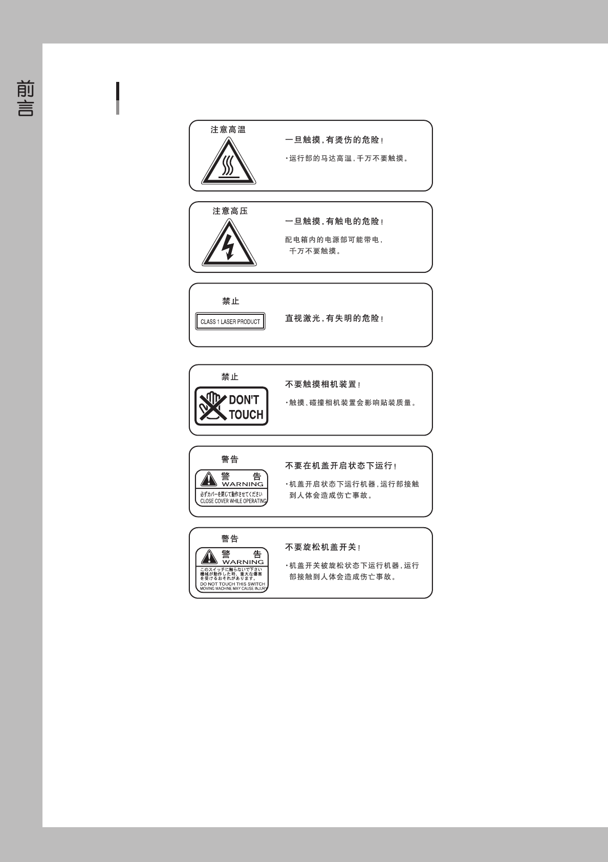 3. 机器运行中,绝对禁止将身体或身体的一部分(手、头)进入机器动作范围内。