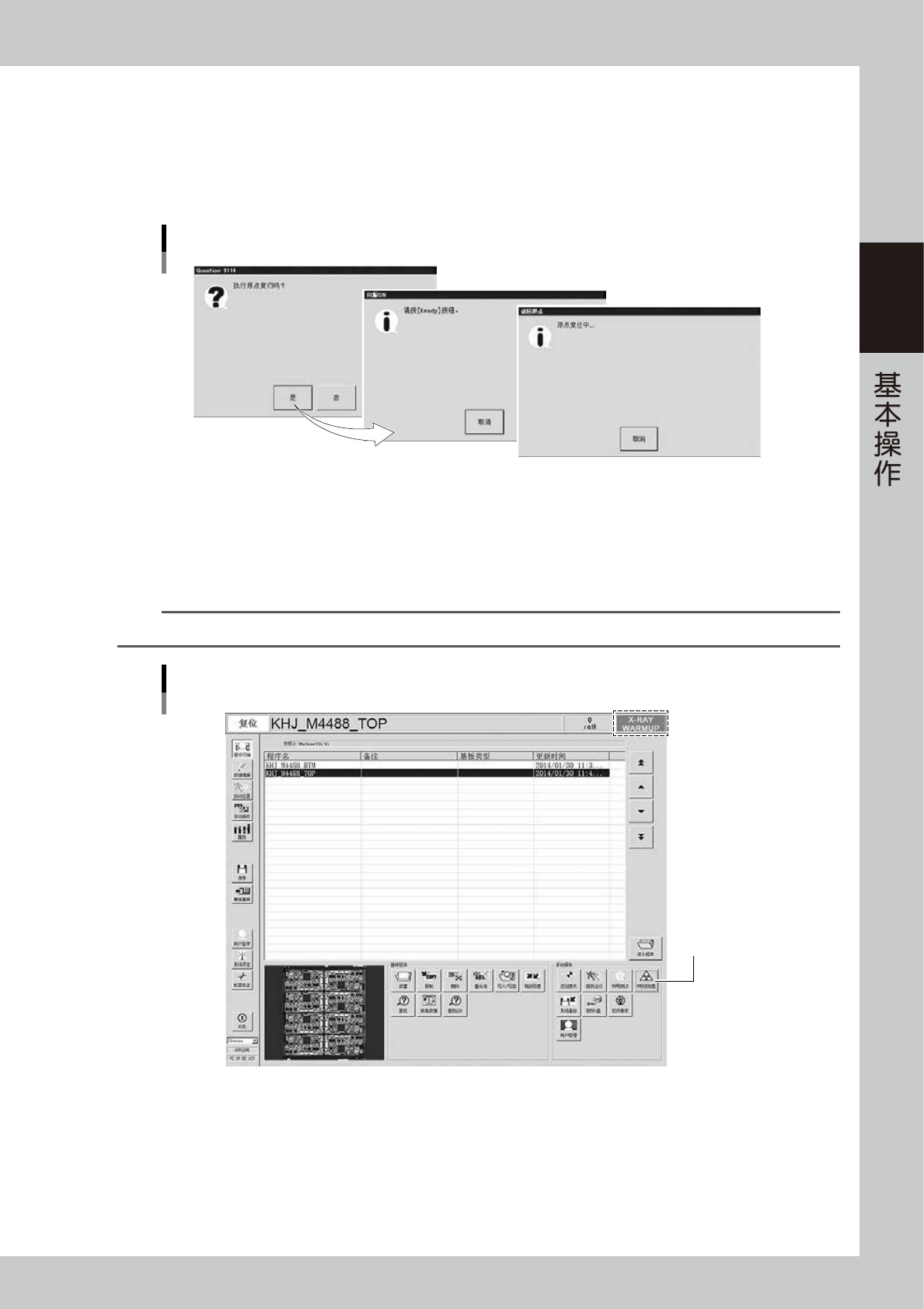 返回原点结束之后,将自动开始 X 射线装置的热机运行。在热机运行过程中,画面上部的状态栏右端将
