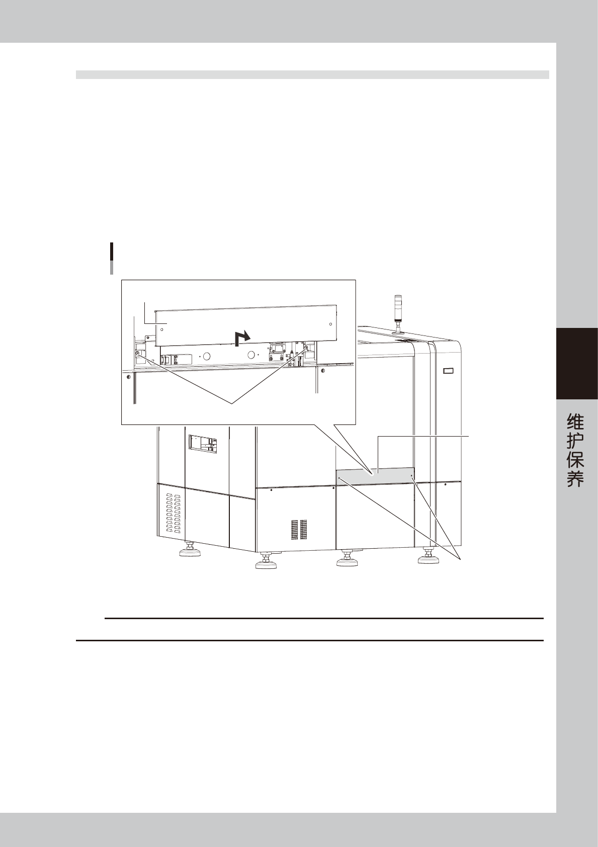 开始维护保养作业之前,请参照本章前述“3.4 背面中央盖板的拆卸方法”拆卸检查机背面的中央盖板,使背面的安全机门可以开关。