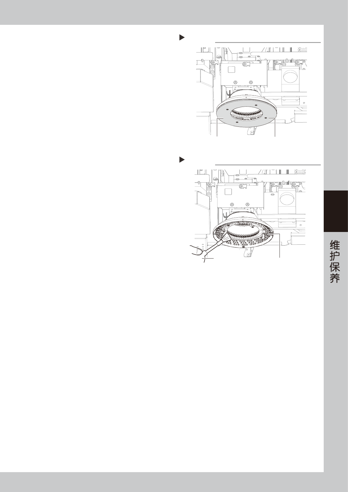 4-10 4 4. 每周 n 要点 开始维护保养作业之前, 请参照本章前述 “3.4 背面中央盖板的拆卸方法” 拆卸检查机背面的中央盖板, 使背面的安全机门可以开关。 维护保养作业结束之后,请务必将拆下的背面中央盖板装回原位。 4.1 相机照明的清洁 光学检查相机的照明若粘附尘屑等,在检查时会导致发生识别错误。为此,建议每周对相机照明进行点检与清洁。 c 注意 清洁时,请注意不要用力过大。因为用力过大会影响相机光轴的精度。 ■ 需…