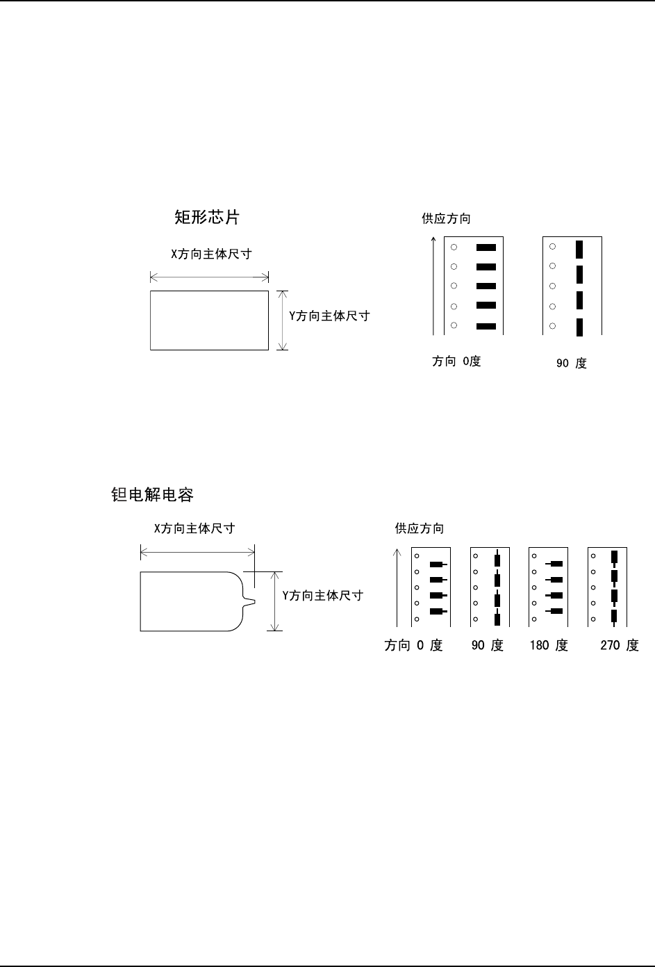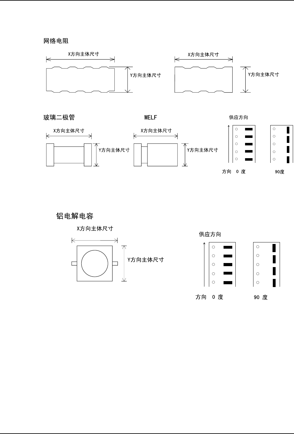 3. 元件数据设置 QD148-03 104 NXT Ⅱ编程手册 VT 62 网络电阻,MELF 在元件数据中输入元件主体尺寸 。不需要输入要素信息。元件基准 点是元件中心。 VT 65 铝电解电容 在元件数据中输入元件主体尺寸 。 不 需要输入要素信息。 请确保像引脚这样的突起部也包含 在元件主体尺寸中。元件基准点 是元件中心。