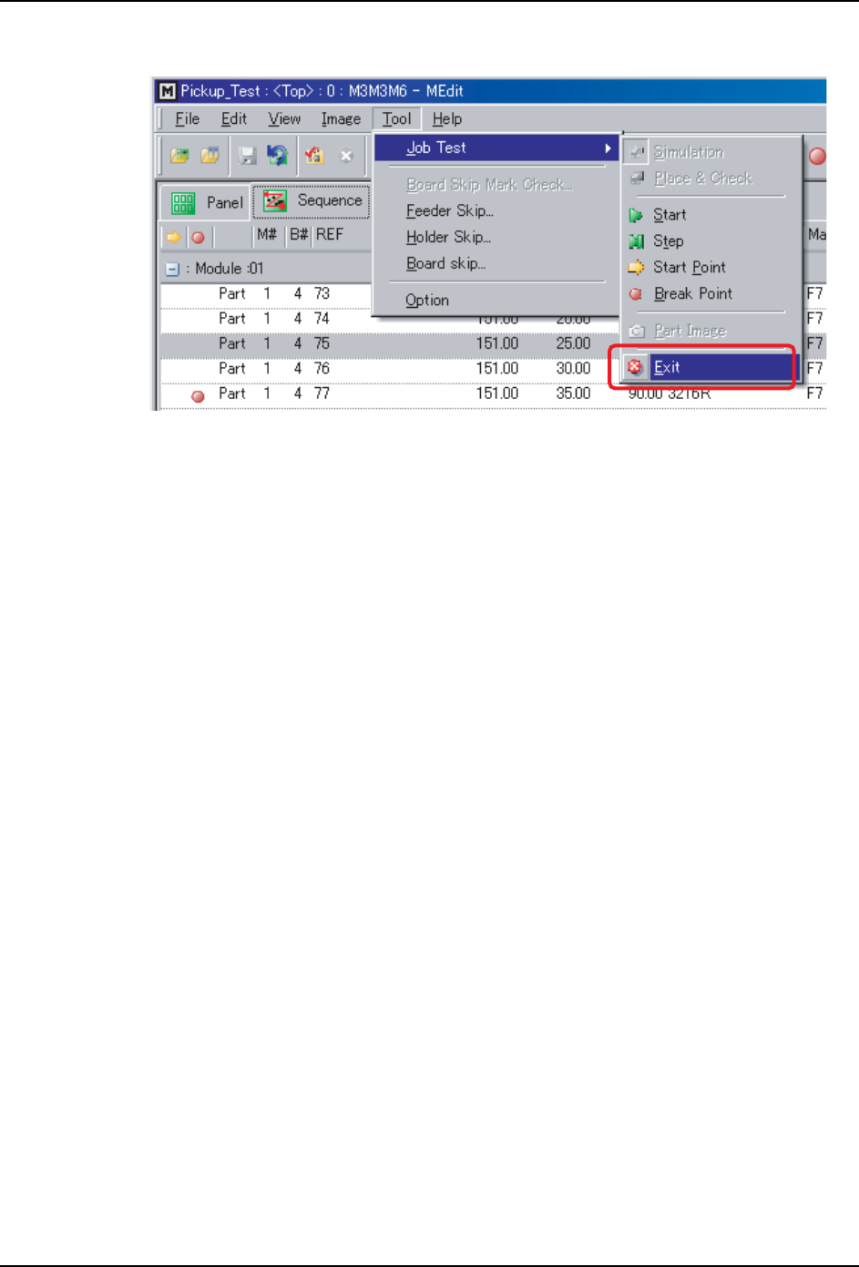 5. 在机器上编辑 Job (MEdit) QD148-03 154 NXT Ⅱ编程手册 退出模拟测试模式 17.当所有模拟模 式的测试都完成后 ,从 [Tool] 菜单中选择 [Job Test]-[Ex it]。 这样就通过模拟模式完成了指定 模组上 Job 的测试。 NXTEJM009