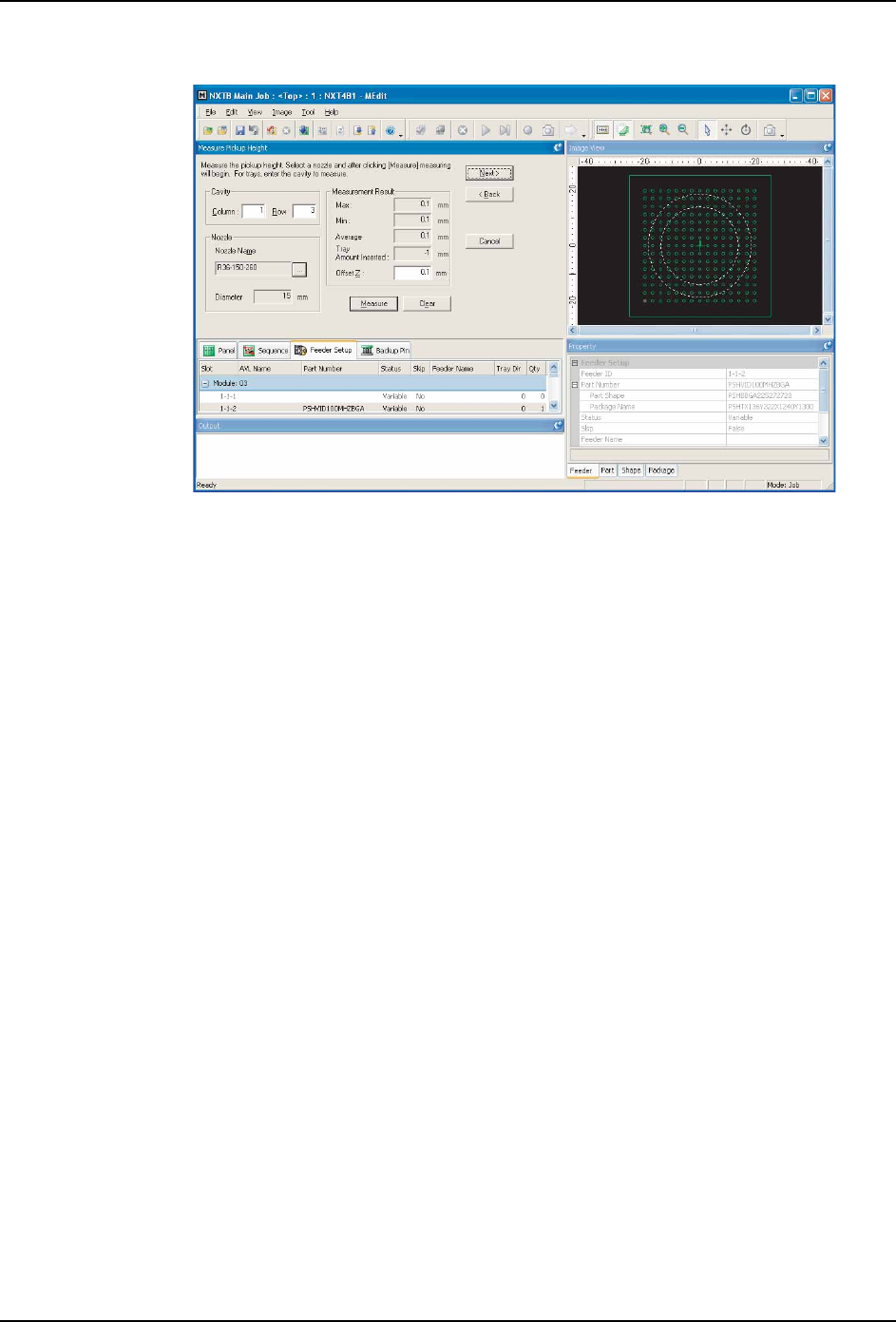 QD148-03 5. 在机器上编辑 Job (MEdit) NXT Ⅱ编程手册 165 检查和编辑料盘的吸取高度 22.显示 [Measure Picku p Height] 步骤。在 [Cavity] 组中指定要执行吸取测试的凹槽位 置 (凹槽中必须存在一个元件) 。 备注 )料盘具有一定的弯曲量, 因此要对多个凹槽执行测量来决定最合适的吸取高度。 (Fuji 建议对中心凹槽和四个边角的凹槽进行测量。) 23.如果必须指定某个 吸取…