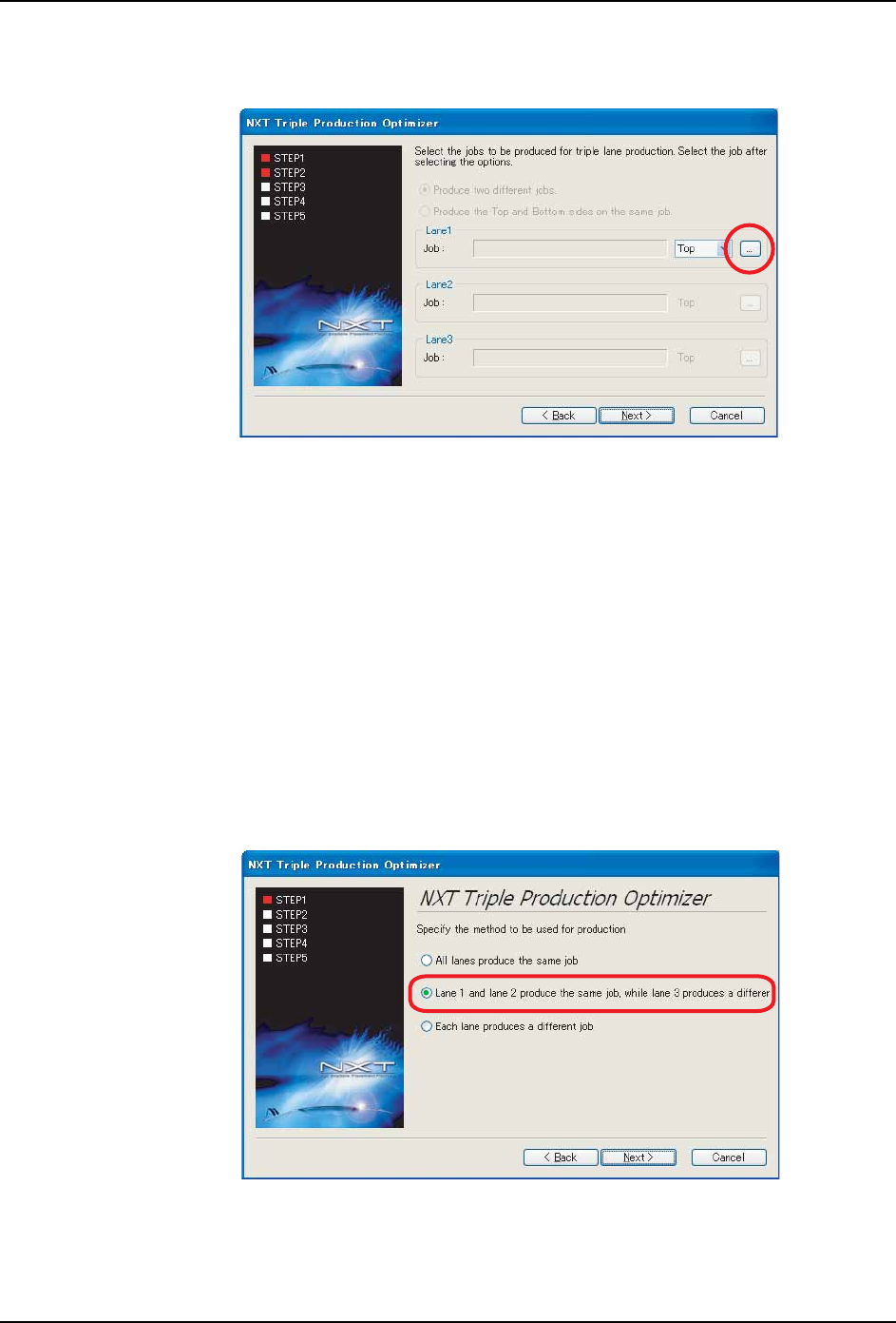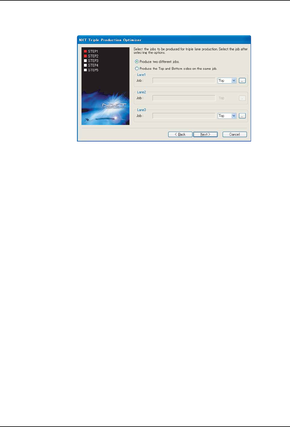 QD148-03 2. Job 编制器 NXT Ⅱ编程手册 59 2. 在 STEP2 中,选择对 2 个不同的 Job 进行优化,还是对 1 个 Job 的正反两侧的电路板面 进行优化。 3. 接着,点击通道 1 的 Job 文本框的右侧的 [...]。能够优化的 Job 被显示在对话框内。 4. 选择想要在通道 1 中进行生产的 Job,然后点击 [OK]。所选择的 Job 名被显示在 Job 文 本框内。 5. 从 [...] 按…